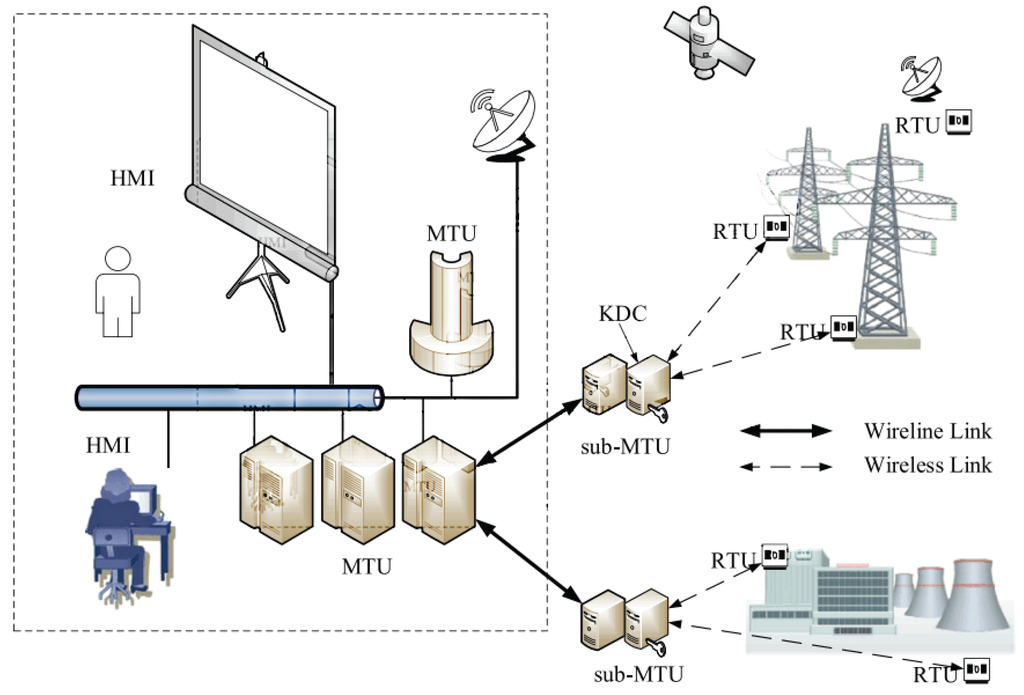 Smart grids are becoming more and more important in modern society. SCADA systems are applied to monitor and control smart grids. The SCADA system consists of human-machine interface (HMI), master terminal unit (MTU), and remote terminal unit (RTU). The structure of these entities is as described in Figure 8 ([40]). HMI is a human-computer interaction device. MTU is in charge of supervisory control to the RTUs. As shown in Figure 8, the SCADA system consists of one MTU and multiple sub-MTUs, and these MTUs have rich resources such as storage space and computational capability. Thus, the public key cryptography can be used to protect the security among them. Compared with MTU, the resources of RTUs are limited. In addition, the RTUs are often located in remote places and the security can not be guaranteed.