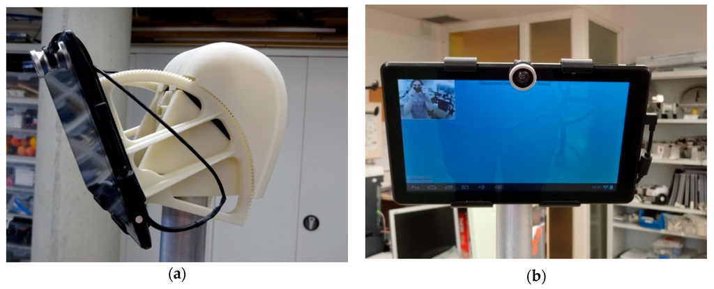 The head of the APR (Figure 4) is designed as the main interface between the tele-operator, the mobile robot and the user. The head is based on the Cheesecake 10.1″ XL QUAD tablet (Approx Iberia, Gelves, Spain). This has four processors, a ten-finger touch interface, network connectivity, and multimedia capabilities in order to create and reproduce audio and video in videoconference communication between the APR and a remote tele-operator. The head of the APR has two small Micromotor DC motors (BS138F-2s.12.608) that provide two degrees of freedom. The head can rotate 120° (60° to each side) and also tilt from 0° to 90°: 0° is with the camera pointing at the ground to offer a zenithal view of people lying down and the contour of the mobile robot, while 90° is the case with the camera pointed to the front. The APR is complemented with a low-cost 180° fish eye lens magnetically attached to the camera of the tablet that can provide a panoramic view of the surroundings.