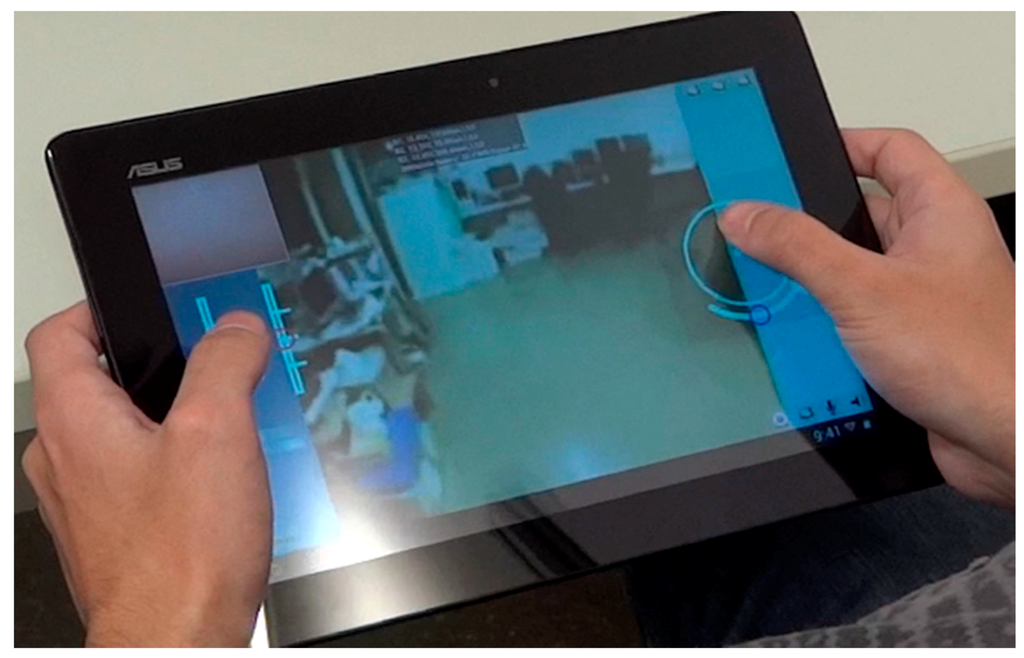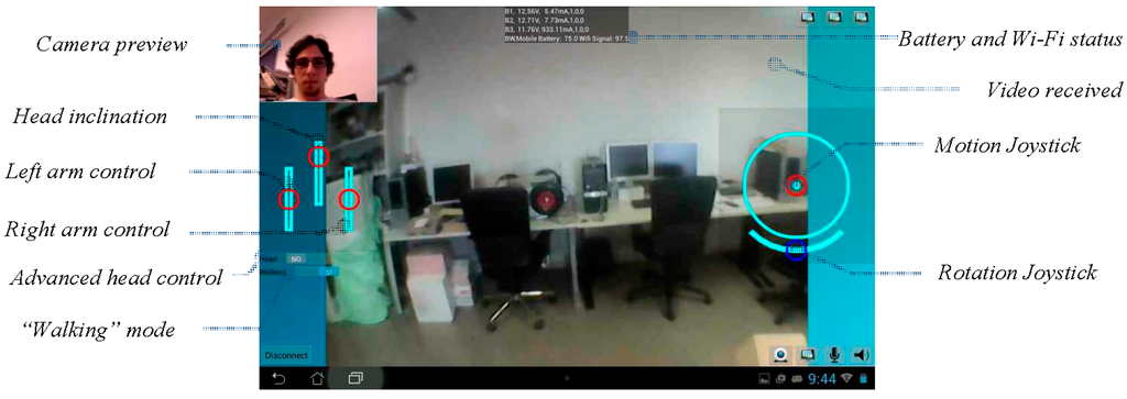The remote control of the APR is performed with an Android application (APP) running in a remote smartphone or tablet. Figure 7 shows an image of the remote control interface. This is based on the touch-screen capabilities of such mobile devices. The telecontrol APP is composed of an on-screen joystick that is used to control the position of the robot, two sliders to control the pan and tilt of the robot head, two sliders to control the robot arms (left and right arm), and an extra slider used to rotate the APR over its vertical axis. The telecontrol APP can be used with one or two fingers by trained and non-trained people. The remote control of the mobile robot is not a challenging task because the high-mobility capabilities of the APR do not usually require intermediate trajectory maneuvers. Future implementations of the telecontrol APP will include such additional features as direct control of the trajectory of the APR with small head displacements [16] in order to allow remote robot control by people with impaired mobility.