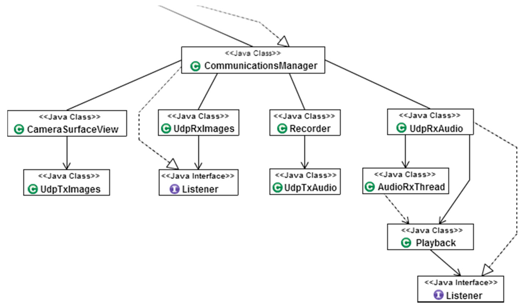 The videoconference system defined in an Android device is controlled from the upper-class CommunicationsManager. This class contains all the methods required to configure and initiate a new videoconference with a remote device. The videoconference system is made up of four different classes: UdpRxImages, CameraSurfaceView, Recorder, and UdpRxAudio. Each of these classes is executed in an independent thread and an independent network socket to limit the possibility of blocking the device in case of unexpected network problems when performing long operations. Figure 8 shows the hierarchy of the videoconference system.