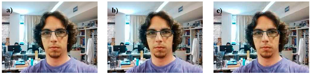 Figure 9 shows a visual example of the impact of the quality parameter on a JPEG compression and decompression. Figure 9 shows the face the remote operator, acquired with a smartphone, compressed as JPEG, submitted to the network, received by the tablet of the APR, decompressed, and shown on the screen of the APR for visual interaction. In this example with small images, the difference between 100% and 60% qualities is almost imperceptible to the human eye while the image size is 12 times smaller. There are also small differences between 60% and 30% qualities in terms of compressed image size, processing time and expected frames per second. The APR uses a video transmission procedure configured to operate with a starting default resolution of 320 × 240 pixels with a JPEG quality factor of 60%. Then, the expected average image submitted to the network is 56 times smaller than the original YUV-NV21 images acquired by the device, and 84 times smaller than the RGB version of the original image. This image resolution can be changed manually during the videoconference or adapted dynamically to the network bandwidth capabilities.