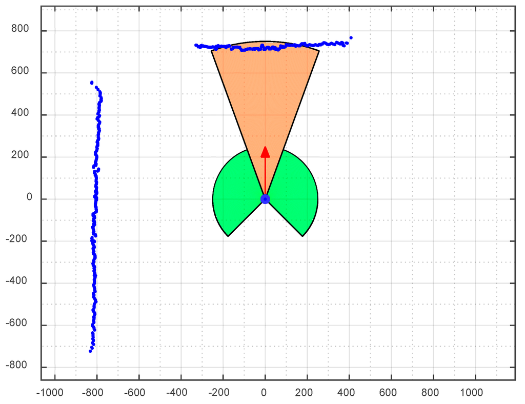 Depiction of the APR position and direction (red arrow), distance data points detected with the LIDAR (blue points) and depiction of the frontal (brownish) and lateral (greenish) safety areas around the mobile robot.