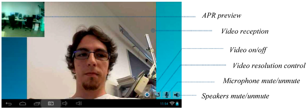 Figure 13 shows the screen of the tablet of the APR with a small window that previews the local image acquired by the APR and submitted during the videoconference, the image received during the videoconference and four main buttons used to control the communication. The buttons enable or disable the submission of video, the submission of audio, the reception of audio, and also change the resolution of the images used in the videoconference. Currently, the complete videoconference starts automatically but the automatic response of the APR can be configured depending on the authorization level of the service in charge of the call.