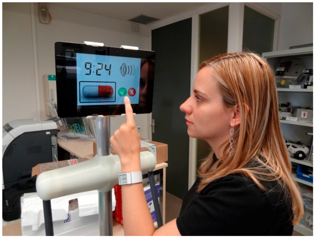 - Pollack, M.E.; Brown, L.; Colbry, D.; McCarthy, C.E.; Orosz, C.; Peintner, B.; Ramakrishnan, S.; Tsamardinos, I. Autominder: An intelligent cognitive orthotic system for people with memory impairment. Robot. Auton. Syst. 2003, 44, 273–282. [Google Scholar] [CrossRef]