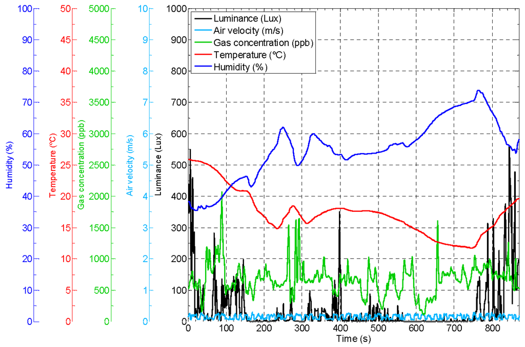 Figure 19 shows the ambient information gathered by the APR during a telecontrol experiment based on the methodologies presented in [29,30] with a common sampling sensory time of 1 s. Figure 19 show the temperature registered by the APR with extreme values of 26 °C in one room and 12 °C in another room with an open window (in winter). The humidity reached abnormal values when the APR was in the room with an open window. The luminance level was poor with the lowest values in an indoor corridor. The air velocity was always low and probably originated by the displacement of the APR. Finally, the measurement of volatile gas concentrations in the air can be performed by using one sensor per gas type or by the use of a versatile sensor [29], which can be configured to measure different gasses. In this case, a photo-ionization sensor (PID) was configured to measure acetone because this was a substance used in the area explored [30]. The results showed a low concentration of acetone in the air during the experiment. The APR can be used as a supporting tool to implement a mobile ambient monitoring platform and develop new assisted-living applications.