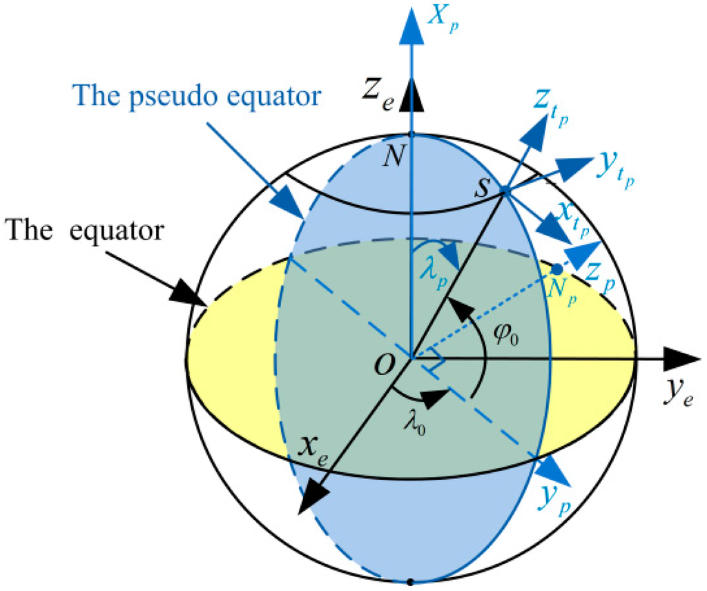As shown in Figure 1, denotes the pseudo-North Pole; the origin of the pseudo-Earth-Centered Earth-fixed frame () is at the Earth’s mass center; the axis points towards the North Pole, which is also known as pointing towards the pseudo-prime meridian; the axis is pointing from the center of the Earth to the projection point of the carrier’s normal frame position on the equator plane; the axis is perpendicular to the axis and conforms to the rules of the right-hand spiral in the equator plane, which is also known as pseudo-North Pole axis.