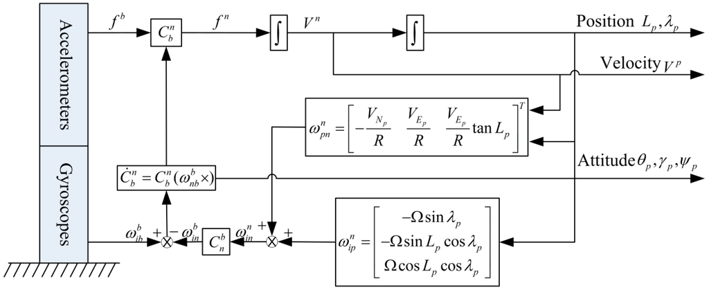 According to the above analysis, the SINS mechanization in the pseudo-geographic frame is given as shown in Figure 2.