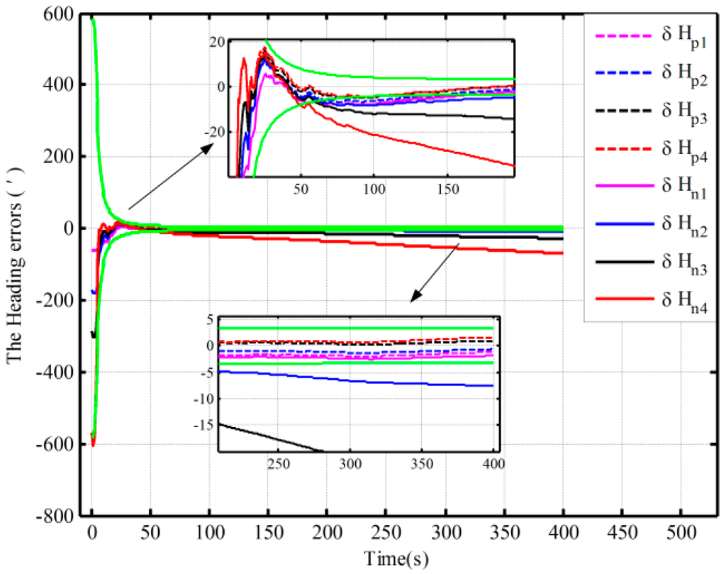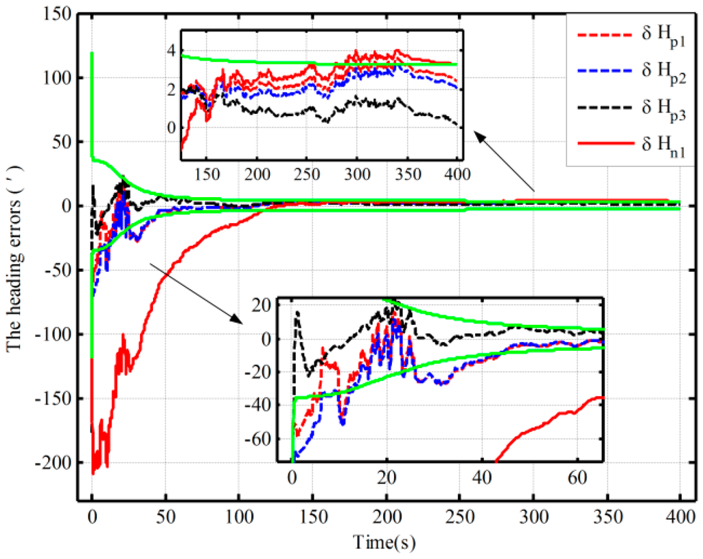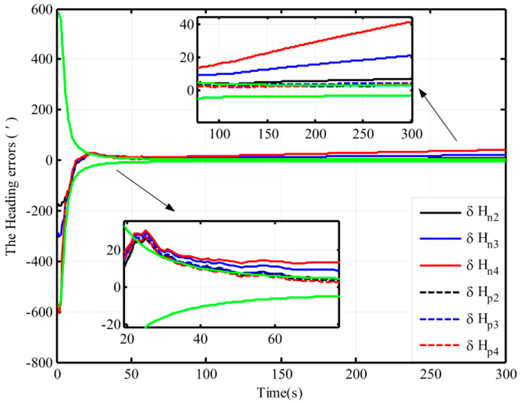 Figure 3 shows the alignment error curves of the attitude by intentionally adding initial attitude errors (1° for heading; 0.3° for both pitch and roll), where the theoretical predictions of the heading (square root of ; for the matrix , if not explicitly stated, all matrices denote the error variance matrix in this paper) is denoted by the green solid lines. In Figure 4, only the alignment results of the heading under the other three cases are shown, where the theoretical predictions of the heading (the square root of in Case 4) are shown with the green solid lines. In Figure 3 and Figure 4, the dotted lines represent the estimations by the proposed algorithm, solid lines denote the estimations based on the traditional algorithm, and the partial magnifications of the alignment results are also shown in the two figures.