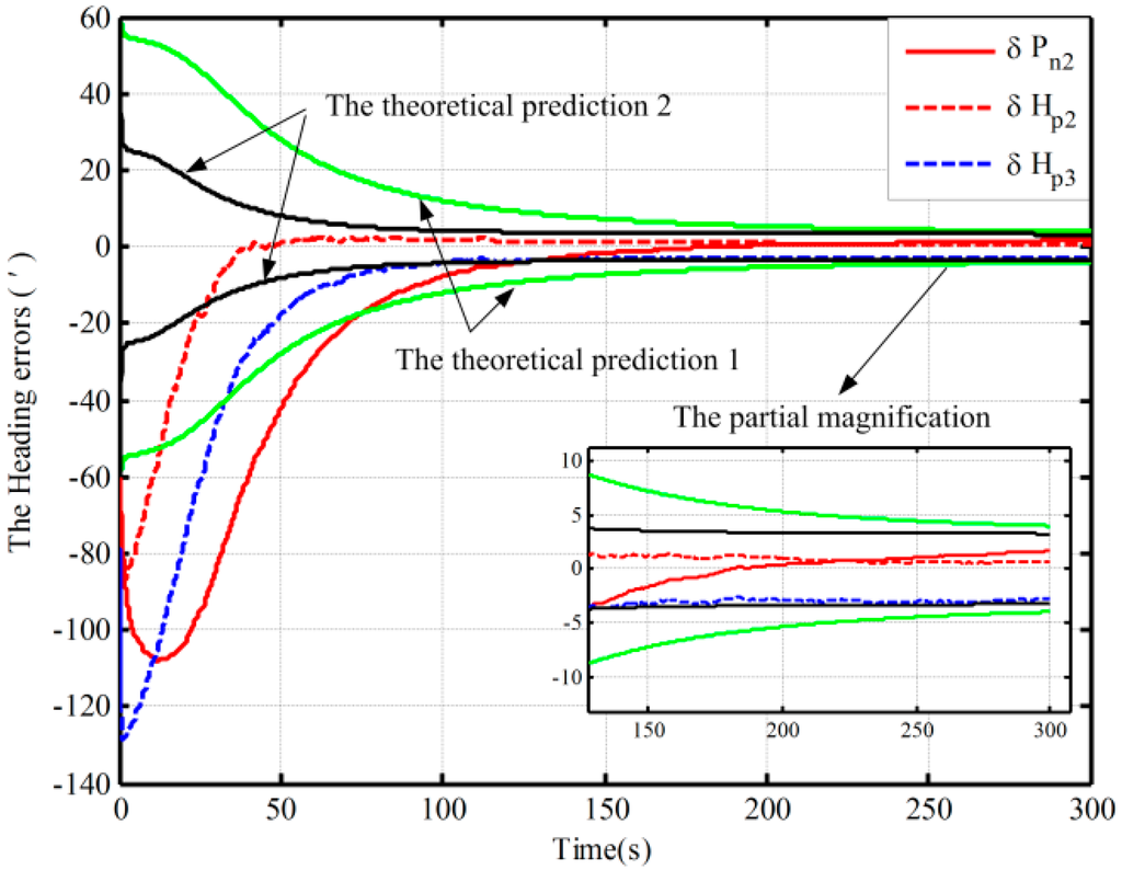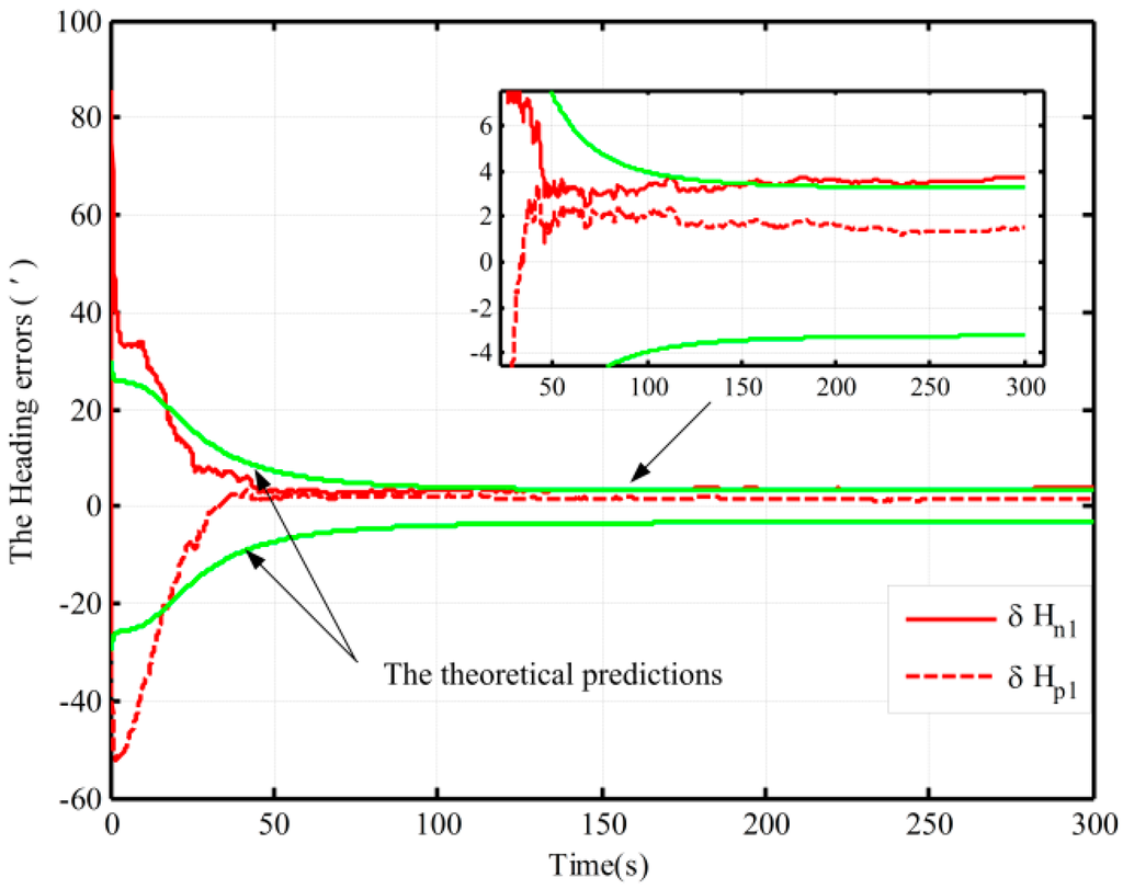 On the other hand, due to the fact that the closed-loop system with the traditional algorithm diverges in Case 2, a method of setting larger initial values of the noise matrix is used to maintain system stability. This alignment result is shown with a solid red line in Figure 6. The theoretical prediction 1 in Figure 6 is the square root of based on the traditional algorithm. And the square root of based on the proposed one in case 2 is denoted by the theoretical prediction 2 in figure 6. Compared with the alignment results with the two methods in Case 2 (the dotted red line and solid line), the estimation oscillation based on the traditional mechanization is still larger at the beginning. Moreover, compared with the theoretical predictions 1 and 2 in Figure 6, the alignment error of heading, which is obtained by using the traditional mechanization and setting larger initial values of the noise matrix, is larger at the end of alignment, and the speed of the convergence is obviously slower. Therefore, the closed-loop system stability can be ensured by setting larger initial values of the noise matrix, but at the expense of the alignment time and accuracy. As a result, the proposed algorithm based on the closed-loop KF has superior performance without much additional complexity.