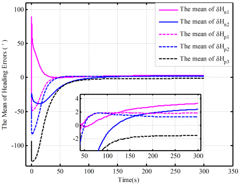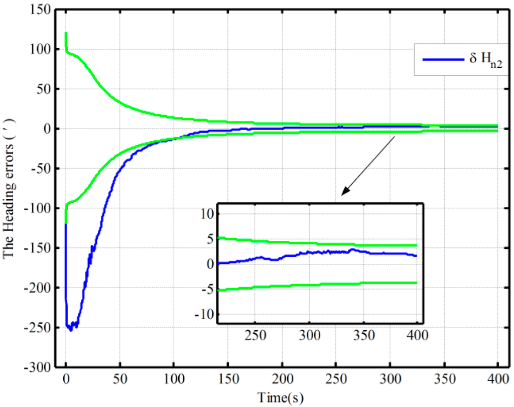 The fine alignment experiments based on the proposed algorithm and the traditional one are done, which is assisted by the open-loop and closed-loop KFs, respectively. The initial conditions of the open-loop KF alignment are given in Table 1, and the closed-loop KF alignment initial conditions is described in Table 5. The alignment results (only heading error) based on the open-loop KF are shown in Figure 10. Figure 11 and Figure 12 show the alignment results based on the closed-loop KF.