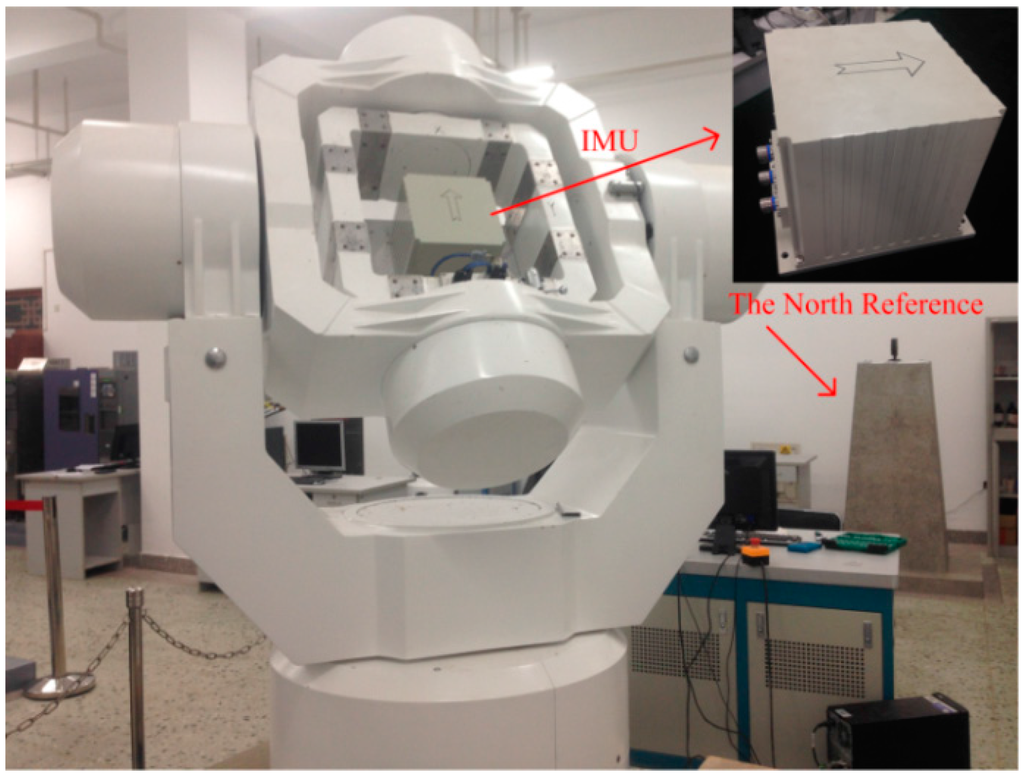 The experimental data were collected with the fiber optical gyroscope (FOG) SINS, fixed in a 3-axis high-precision turntable as shown in Figure 9. The inertial measurement unit (IMU) and the North Reference are also shown in the figure. The FOG SINS was made by our lab (namely, The Institute of Inertial Navigation and M&C Technology), and its sampling frequency is 100 Hz. The local longitude and latitude is 126.6778° and 45.7778°, respectively. Moreover, the attitude reference value of IMU is provided by the 3-axis high-precision turntable.