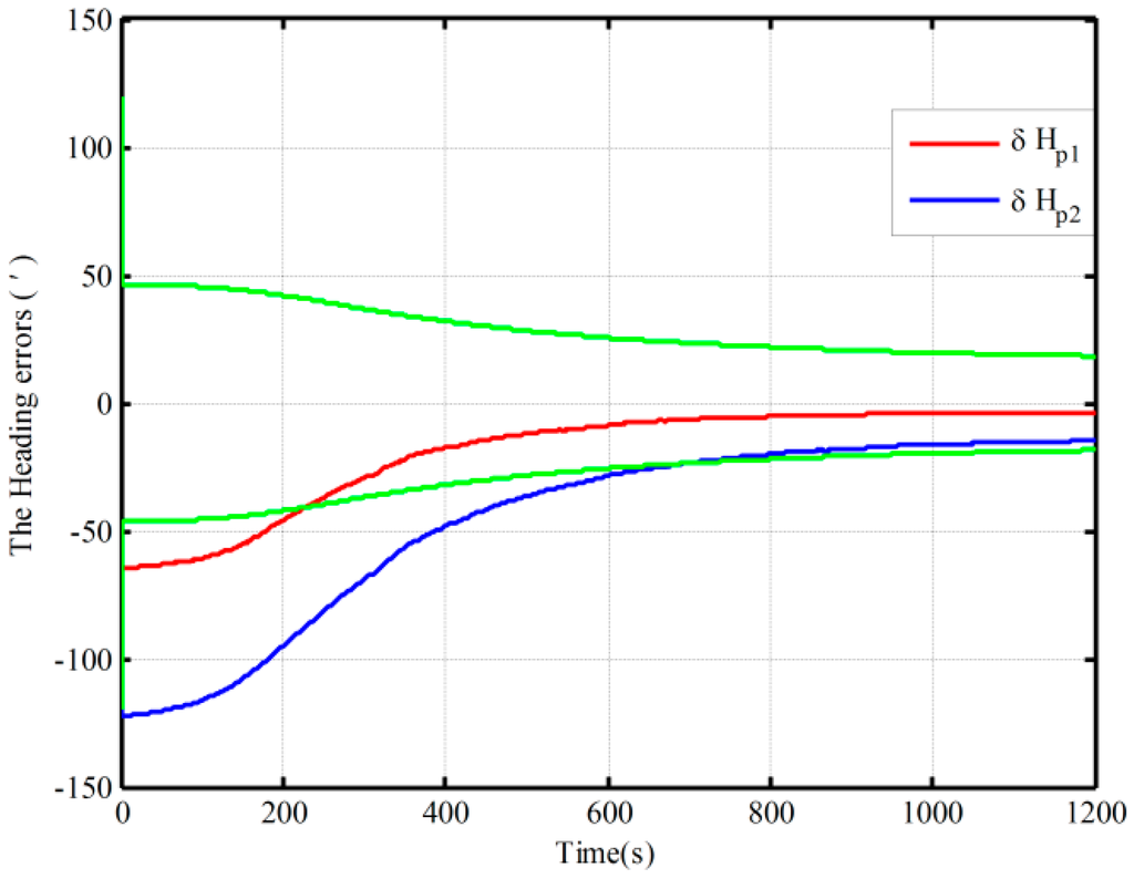 As seen from Figure 13 and Figure 14, all the estimation curves converge with time. Figure 13 shows the polar alignment results based on the proposed mechanization under the three different initial conditions when the latitude is 85°, where the heading alignment errors are all less than 3.8′ in 1200 s. The heading alignment errors under the two cases are less than 18′ in 1200 s at 89° latitudes from Figure 14, and the alignment results do not display an obvious difference under different initial conditions in the two figures. On the other hand, the highly accurate coarse alignment is also difficult to achieve due to the smaller gyrocompass component. As a result, the proposed mechanization has a good ability in polar alignment because it requires less accurate coarse alignment. Therefore, the proposed mechanization can solve the problem of polar alignment coming from the coupling between the level movement errors and the heading error.