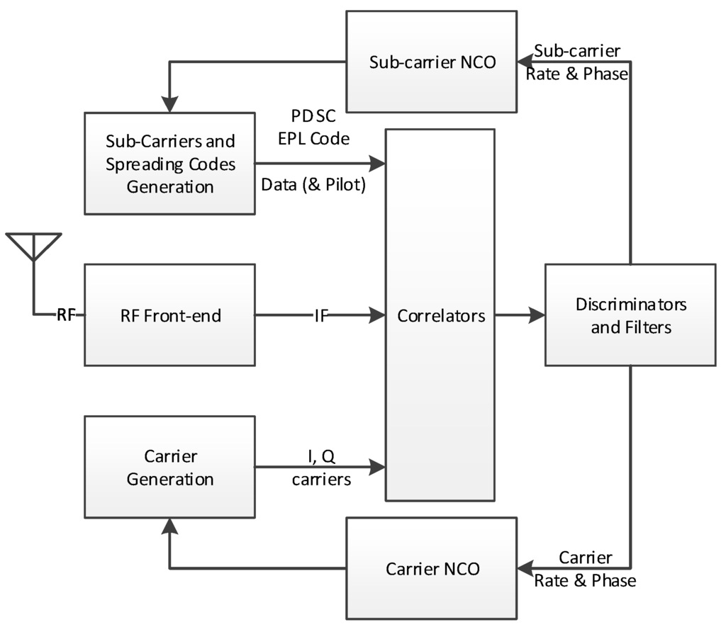 - For each component, both 1-bit square sub-carriers are delayed to obtain Early (E), Prompt (P) and Late (L) replicas; the correlator spacing is set to with the fastest sub-carrier period .