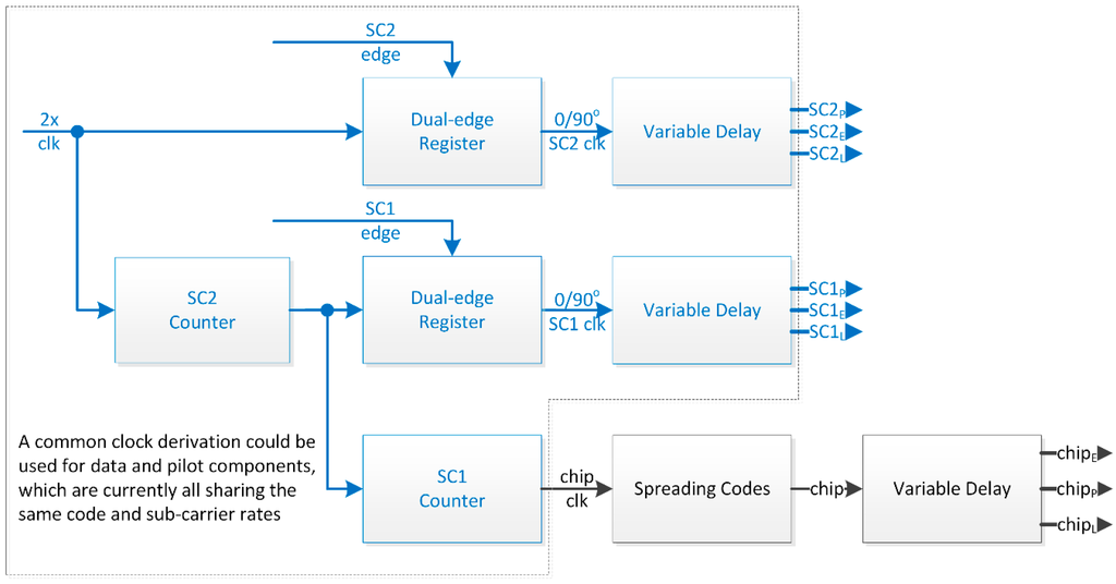 To properly deal with signals characterized by a quarter of a cycle phase shift between chip transition and carrier rising edge (i.e., cBOC), a minimalistic approach requires a source clock with twice the required rate and a dual-edge register, as depicted in Figure 2. This approach would equally apply to Galileo E1A signal with , where a sub-carrier six times that of the spreading code rate, both clock signals being in phase quadrature.