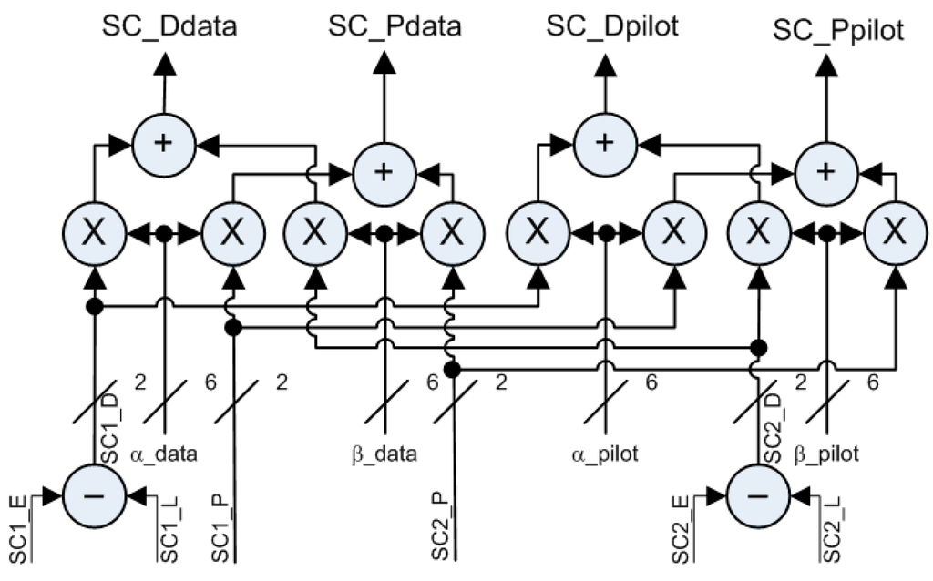 Furthermore, CBOC and TMBOC impose different sub-carrier amplitudes. Pursuing a matched filter approach, the replica should mimic the targeted signal as much as possible. The resulting weighing factors α for sub-carrier SC1 and β for SC2 must carry the following values: and . The signed resolution requires a total of 6 signed bits to induce a representative ratio between one another: with , introducing a potential scaling loss. These 6-bit coefficients may be updated at every chip in this simple TMBOC implementation, as depicted in Figure 3. For example, during the sequential acquisition process, four steps are followed: