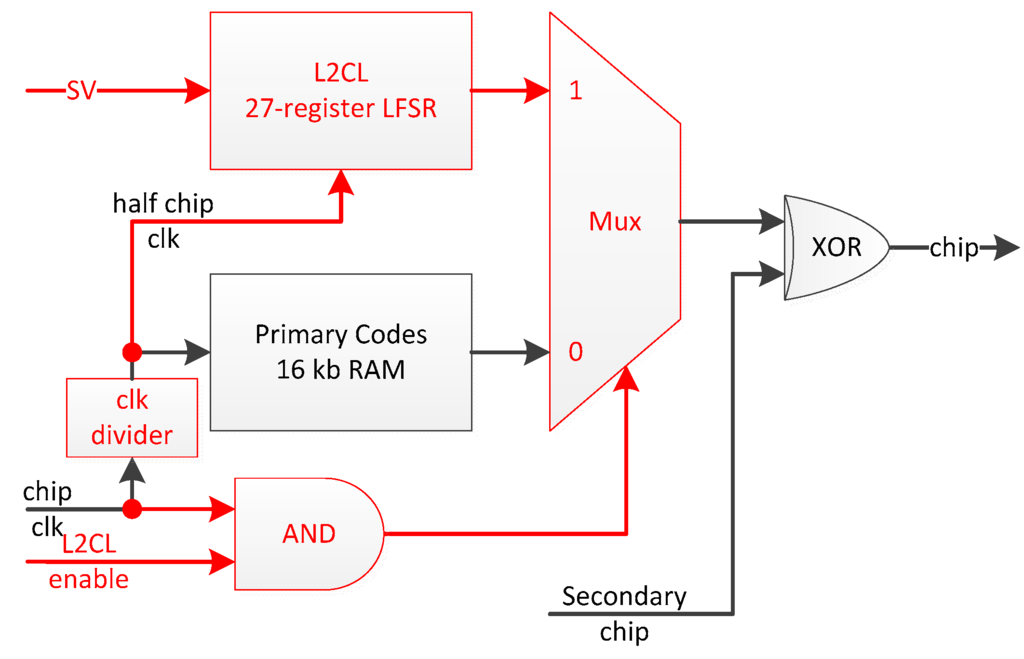 As seen in Table 1, codes have different lengths and generation methods. Since all signals have their own primary (and secondary) code generation method, a universal channel would need to support them all. Linear Feedback Shift Register (LFSR) logic is definitely the best approach in the case of a dedicated signal channel. However, duplicating such resources customized for every signal becomes a burden: one channel can only track one signal at a time, resulting in many idle resources. Furthermore, considering this highly dynamic field, one may want to plan ahead. Indeed, a pre-computed memory code approach not only applies to all currently defined signals, but also allows for an easy, over-the-air, update link whenever a new Signal In Space (SIS) Interface Specification (IS) is released.