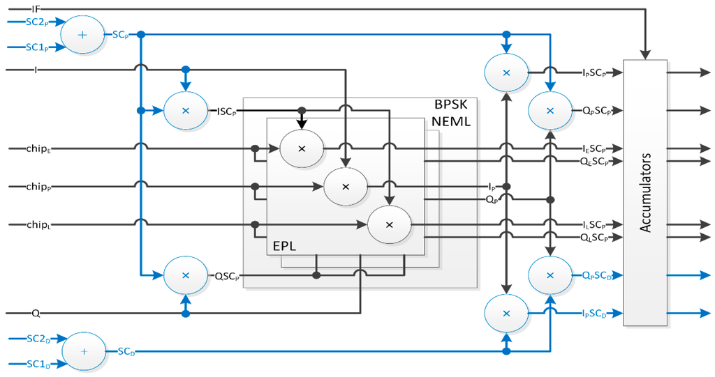 In order to provide the feedback to the carrier and code NCOs, several feedback signals are required to compute the error to be compensated for. For the code, a Non-coherent Early Minus Late (NEML) discriminator requires three correlators, i.e., E, P and L code replicas on both the phase (I) and quadrature (Q) branches as illustrated in Figure 5. With the current implementation based on 4 16-bit addressable registers (as opposed to dedicated RAM blocks with improved delay resolution), the different code replica offsets may belong to samples, thus achieving a correlator spacing slightly larger than ±½ chip for a 1.023 Mchip/s spreading code. The resulting 6 correlators are deployed for both components of a signal.