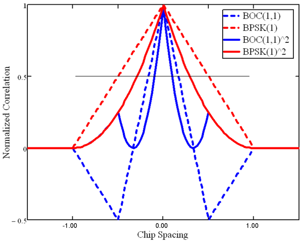 The main complication introduced by the new signals is the ambiguous BOC Auto-Correlation Function (ACF). Indeed, the squared ACF introduces the possibility of tracking any peaks separated by the sub-carrier half period , with the sub-carrier to chipping rates doubled ratio . In the simplest case of BOC(1,1), there are two side peaks, whose tracking would induce a Pseudo-Range (PR) error of ~150 m. Hence, BOC ACF ambiguous tracking [13], requires adapted tracking approaches, some of which are categorized in Table 2.