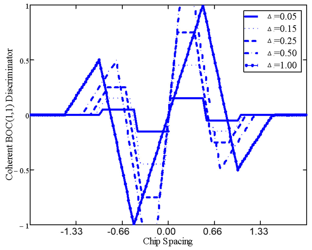- Morrissey, T.N.; Shallberg, K.W.; Townsend, B. Code tracking errors for double delta discriminators with narrow correlator spacings and bandlimited receivers. In Proceedings of the 2006 National Technical Meeting of The Institute of Navigation, Monterey, CA, USA, 18–20 January 2006; pp. 914–926.