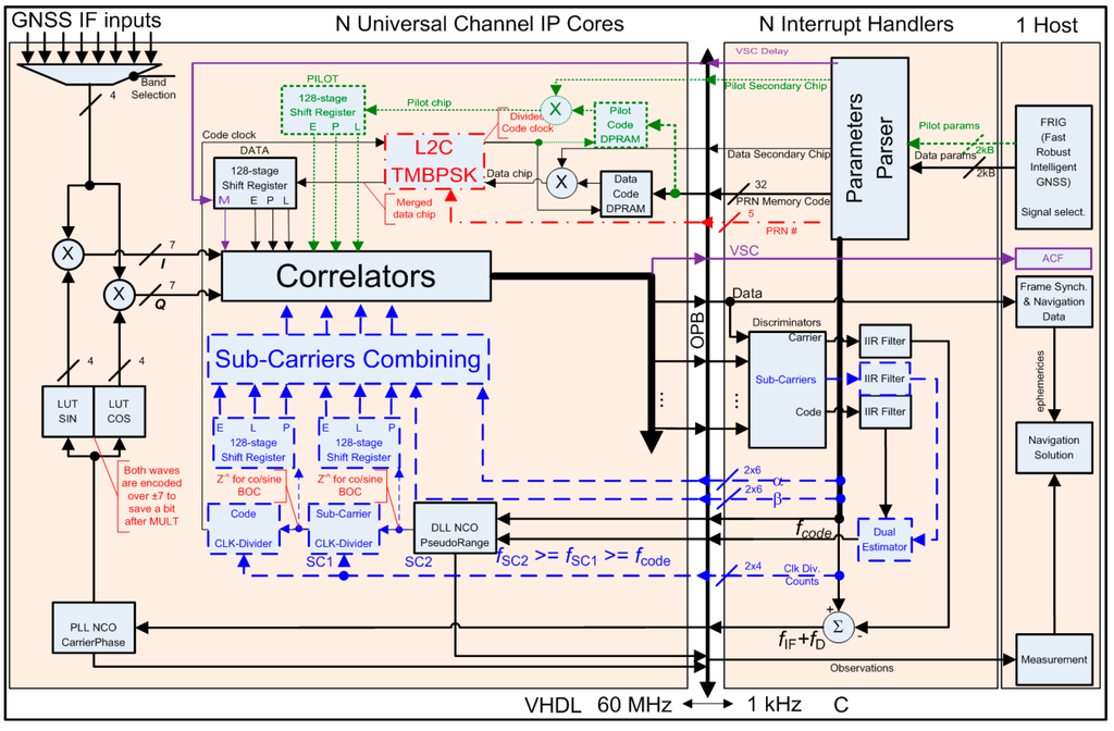 Thanks to the modernization of GPS and GLONASS as well as the advent of Galileo and BeiDou, new signals are being broadcasted, or at least should start being transmitted shortly. These signals aim the answer the traditional GPS limitations. Indeed, higher bandwidths will help resist interferences by diluting the impact of a narrowband interference over a larger bandwidth [6]. This should also provide better positioning accuracy and resistance to multipath with a faster chipping rate [7], thus requiring a smaller correlator spacing and a higher sampling rate. Longer codes will increase signals’ cross-correlation protection and their robustness in weak signal environments. The multiplication of active satellites will increase availability, while integrity should be improved through more detailed navigation messages and deployment of new control stations, as well as new generation satellites with improved on-board clocks. This context calls for implementing new robust acquisition and tracking architectures, in a compact design, that are capable of harvesting all the potential of these new signals. Indeed, considering over 530 civil GNSS RF signal components (namely data and pilot) available worldwide, half of which being visible to any ground-based user, the importance of reducing the total complexity while maximizing global robustness and precision becomes more than desirable.
