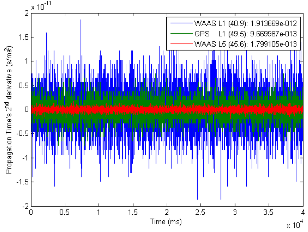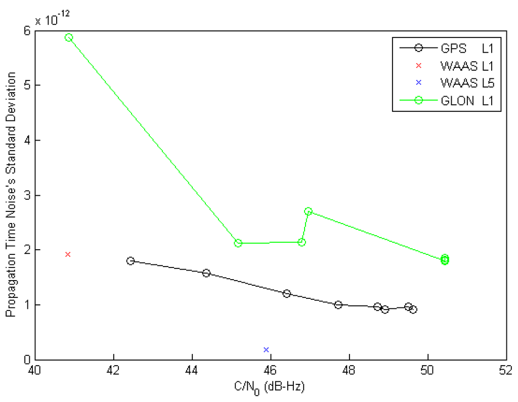 Different signals pseudo-range noise is further compared vs. signal strength in Figure 12, where it can be seen that WAAS L1 quality is in line with that of GPS L1 C/A (as they have the same chipping rate), while GPS L5 appears 10 times better for a given C/N0 (with 10 times the chipping rate). Signals intrinsic phase noise can be a dominant contributor to carrier and pseudo-range measurement performance, resulting in measurement errors.
