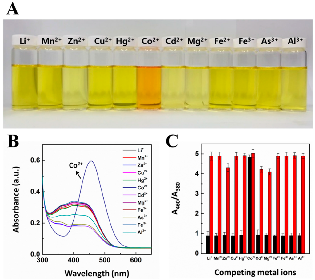 (A) Photographs for color changes of CG chemosensor upon addition of various metal ions under visible light; (B) UV-vis absorbance spectra of CG chemosensor upon the addition of various metal ions in solution; (C) High selectivity toward the cobalt ions and Absorbance responses of CG containing Co2+ with the other competing metal ions. The concentration of CG chemosensor and cobalt are 7 × 10−5 M and 2 ppm, respectively. Each experiment was conducted three times.