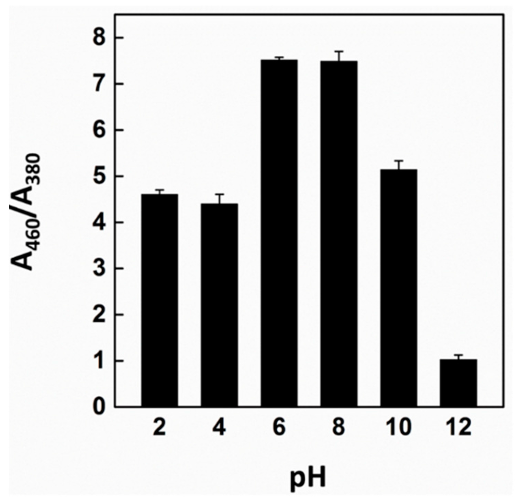 To examine the effect of pH, the desired pH solution was prepared by adjusting 1 N NaOH or 1 N HCl. The pH of the solution was measured using a SevenCompact™ pH/ion S220 meter (Mettler Toledo Instruments Co., Greifensee, Switzerland). Moreover, various concentric CG chemosensors were prepared to determine the initial concentration of the CG chemosensor (7 × 10−4 M, 7 × 10−5 M, and 7 × 10−6 M).