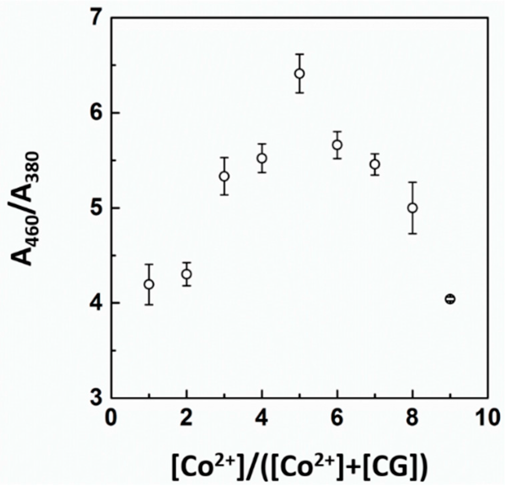 To determine the stoichiometry between a CG chemosensor and cobalt ions, a Job’s plot experiment was carried out (Figure 3) [44]. The stoichiometry of binding between the CG chemosensor and cobalt was determined by keeping the sum of the initial concentrations of the CG chemosensor and cobalt constant at 10 μM and varying the molar ratio of Co2+ (Xm = ([Co2+]/([Co2+] + [CG])). By following the change in absorbance ratio (A460/A380), the maximum absorbance ratio of the CG-Co2+ complex was achieved at a mole fraction of approximately 50% of the cobalt ions. This result suggests that the stoichiometry of binding of the CG chemosensor with cobalt ions is 1:1. Based on the stoichiometry study, we estimate that the complexation between the CG chemosensor and cobalt can be attributed to the hydrated cobalt size and the entropic free volume and spatial arrangement of azobenzene and the amino groups of Chrysoidine G [45,46]. Thus, a proposed mechanism of CG-Co2+ binding can be presented (Supplementary Figure S2).