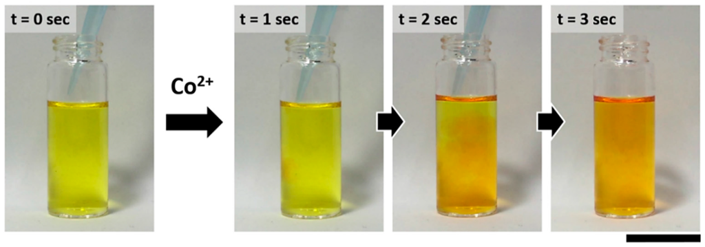 A fast response time is an important factor in analytical sensing applications for real-time monitoring. To envision a real application, we conducted a real-time imaging experiment of the reaction between the CG chemosensor and cobalt. Interestingly, the color transition of an aqueous CG chemosensor solution occurred within a few seconds in the presence of cobalt ions, as shown in Figure 4. When 5 ppm of cobalt ions were added to an aqueous CG chemosensor, it gradually changed from yellow to light orange within 3 s. These visible results suggest that the CG chemosensor can be applied to the real-time monitoring of a portable indicator with simple and rapid ‘naked eye’ detection of cobalt.