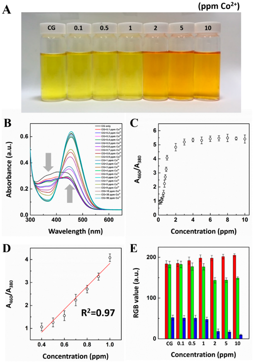 Colorimetric titration of cobalt. (A) Photographs for the color change of CG chemosensor to the concentrations of cobalt; (B) UV-vis absorbance changes of CG chemosensor in the presence of a serial concentration of the cobalt; (C) Intensity ratio (A460/A380) versus the different concentrations of cobalt ion added; (D) Linear plot of cobalt concentration based on UV-vis absorbance analysis; (E) Quantitative analysis for RGB color profile of CG-Co2+ complexationss. The concentration of CG chemosensor and cobalt are 7 × 10−5 M and 2 ppm, respectively.