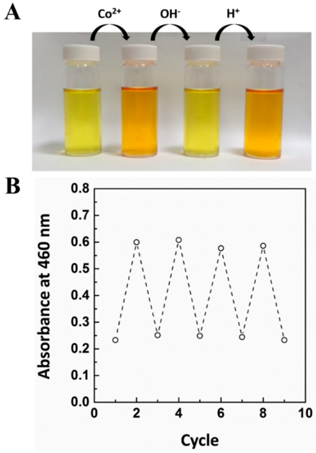 (A) Photographs of the reversibility behavior between CG chemosensor and cobalt; (B) Continuously repeated UV-Vis absorbance profile during stepwise “on-off” switch reaction. The concentration of CG chemosensor is 7 × 10−5 M.