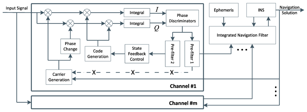 The ultra-tight GPS/INS integration originates from vector tracking [3]. Its core concept is using the known ephemeris and the corrected inertial navigation information to calculate tracking parameters. Namely, satellite signal locking is assisted by the integrated navigation filter, and GPS tracking channels no longer remain independent of each other. According to the structural design of the filter models, the ultra-tight GPS/INS integration methods can be roughly divided into two types. In one case, a single high-dimensional filter is used to estimate the GPS tracking parameters of each channel and navigation parameters together [4,5], and in the other case, each channel has a baseband signal pre-filter which estimates the tracking parameters for itself, and the integrated navigation filter just needs to estimate the navigation parameters. The second category is actually a form of federated filtering, and usually has higher computational efficiency [6,7,8].