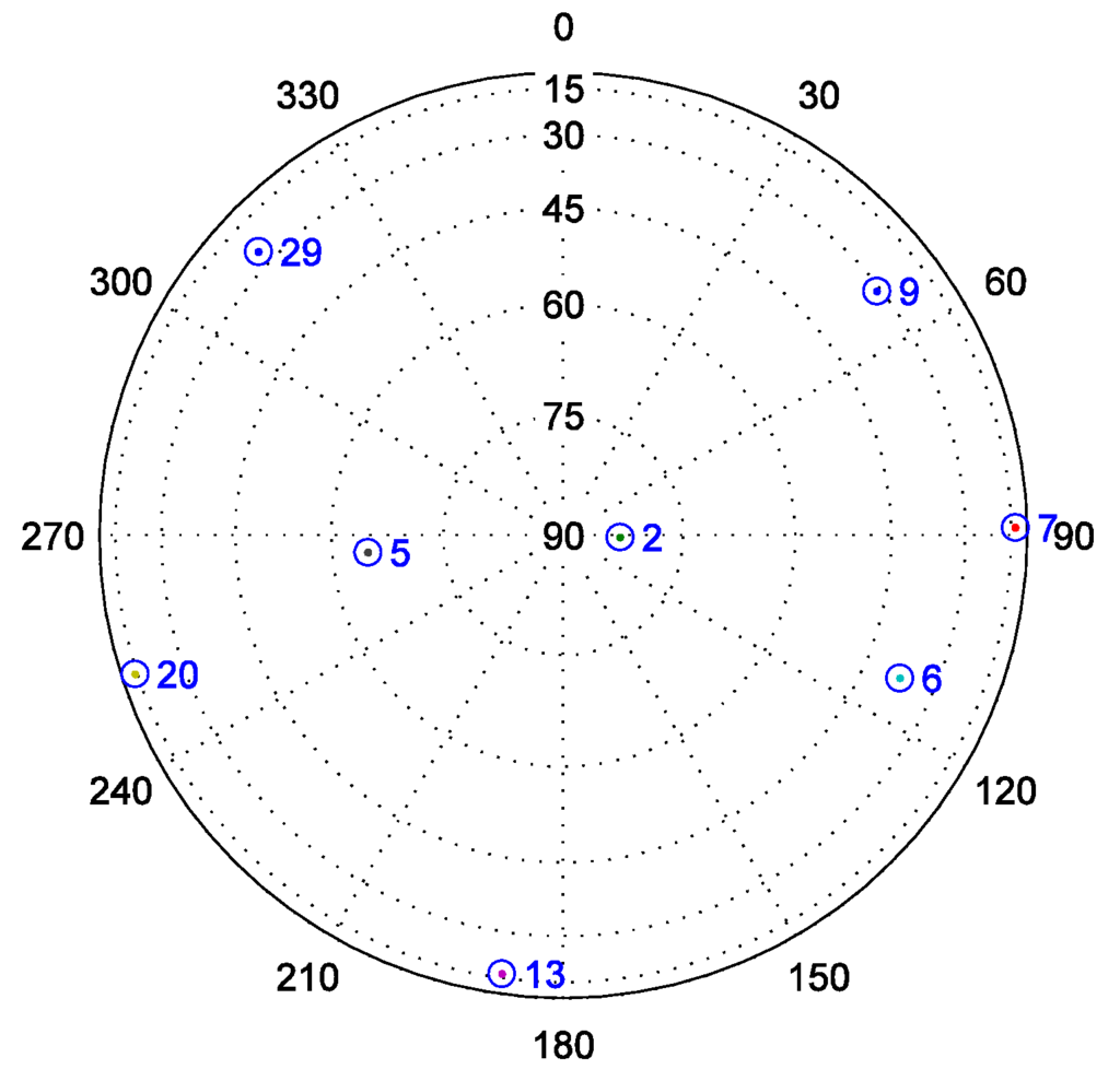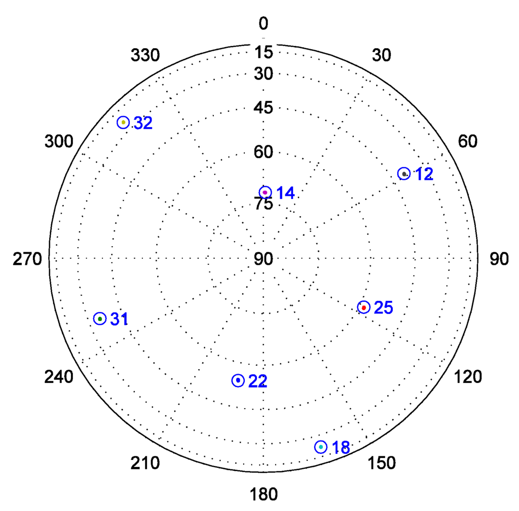 Although the baseband signal preprocessing model and the ultra-tight GPS/INS integration can both restrain noise better, the field test is carried out in an open-sky area (, , ) and does not involve the weak signal problem. After collecting signals with a radio frequency front-end, seven satellites are chosen according to their high Carrier-to-Noise Ratio listed in Table 1. The sky plot of these satellites is shown in Figure 3, and the elevation of each satellite is always greater than during the test.