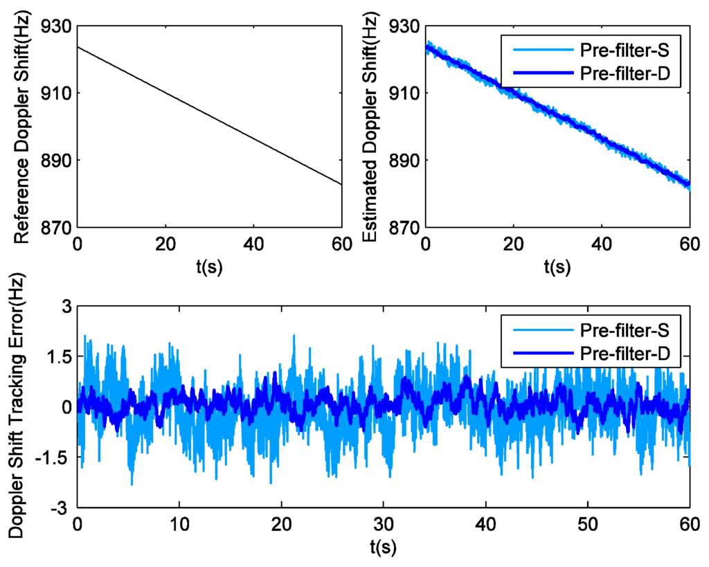 Pre-filter-S usually has better performance than the popular error-state filter (pre-filter-E). Taking PRN25 for example, Figure B1 shows the differences between tracking errors obtained by pre-filter-E and pre-filter-S. According to statistic analysis, the RMS values of Doppler shift and code phase tracking errors corresponding to pre-filter-E are respectively 1.028 Hz and 1.62 chip. For pre-filter-S, these two values are 0.487 Hz and 1.55 chip.