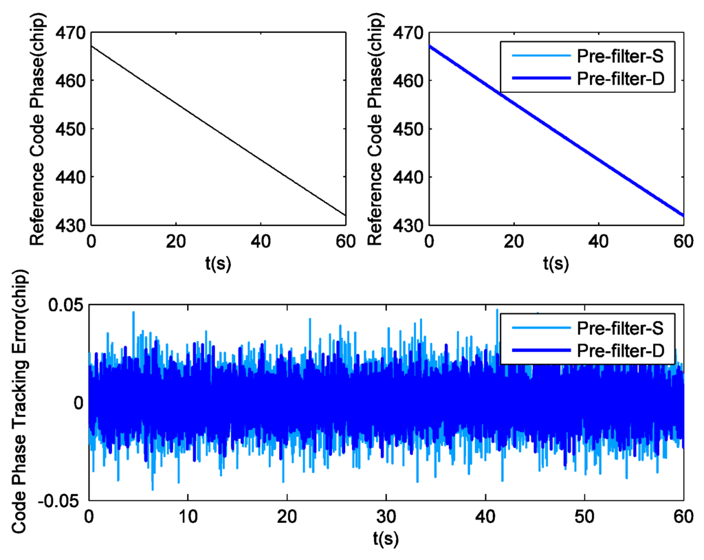 Similarly, the state vector of pre-filter 2 is set to , where is the code phase error (unit: chip), is the input code frequency, and is the changing rate of the input code frequency. Meanwhile, in consideration of the following formula: