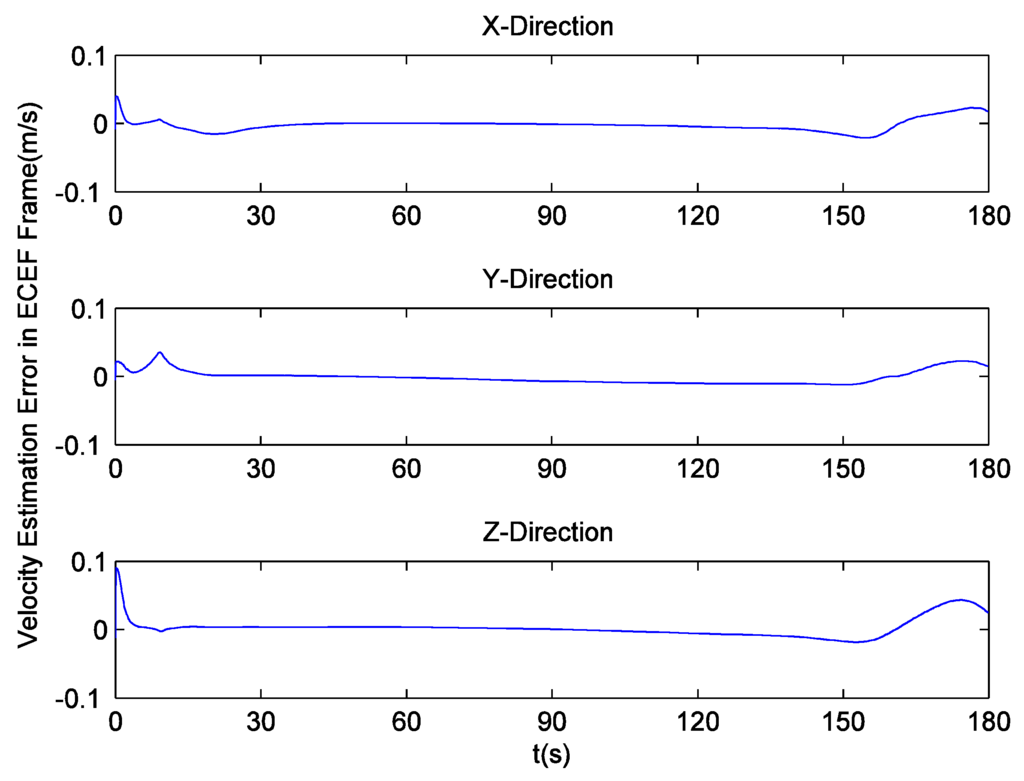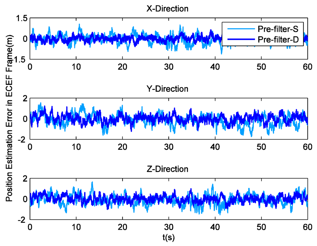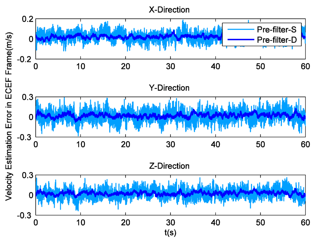 To analyze the impact of tracking parameters on position and velocity detection, receiver implements navigation through Least Squares (LS). The position estimation errors in the ECEF coordinate system are shown in Figure 6, while their corresponding RMS values are listed in Table 2. It can be seen that pre-filter-D makes positioning more precise. Then, Figure 7 illustrates the velocity estimation errors in ECEF frame, and Table 3 lists their RMS values. Obviously, there are multiple glitch impulses in the velocity estimation result output by the receiver employing pre-filter-S, which is quite similar to the situation in Doppler shift tracking. Sometimes the velocity errors in the and direction are even close to 0.3 m/s. On the contrary, the other receiver achieves comparatively stable and accurate outcomes. The absolute maximum values of the velocity errors are smaller than 0.1, 0.13 and 0.12 m/s, respectively.
