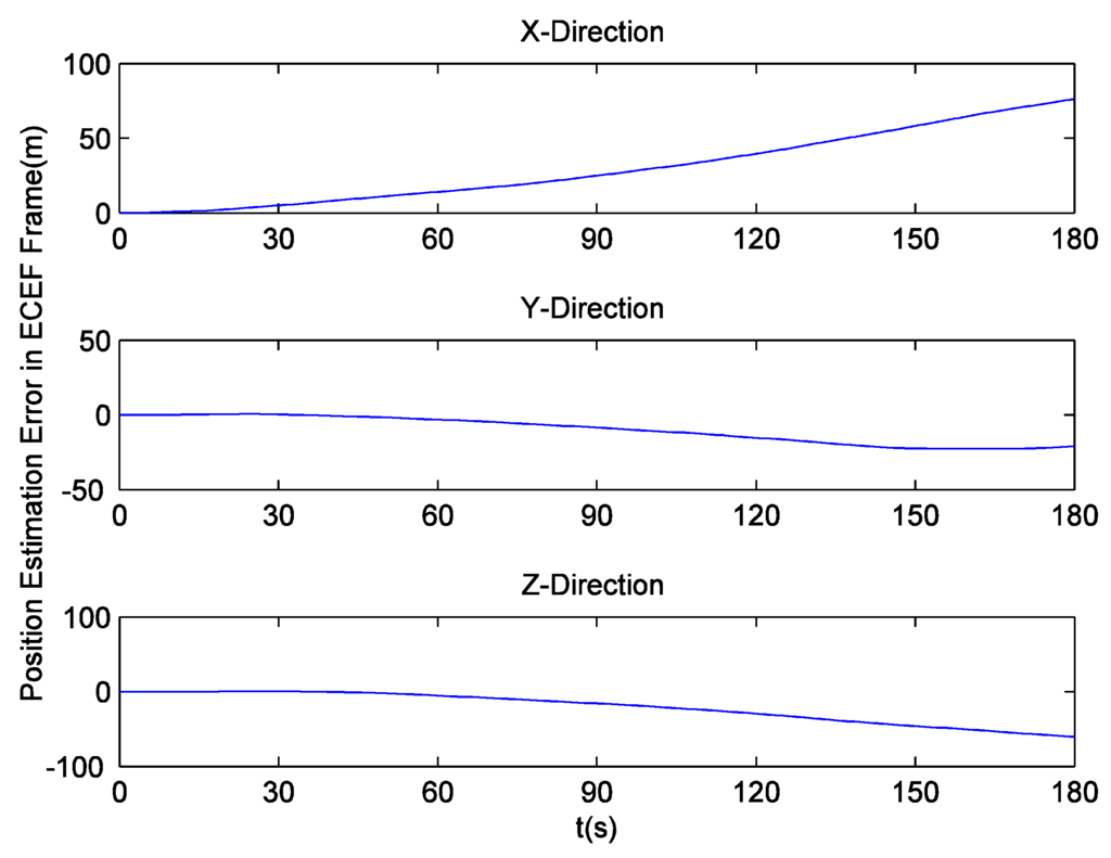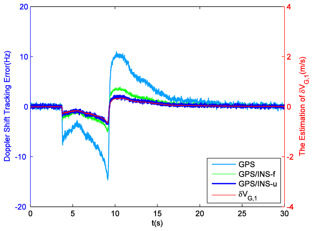 where is the speed of light. But in fact, under highly dynamic conditions, the carrier phase of satellite signal may be proportional to time to the power of or higher value, and hence the estimated carrier frequency may contain a large error . Since the incorrect GPS outputs could destroy the estimation of INS errors, it is necessary to analyze this error in detail. Therefore Equation (27) is rewritten as: