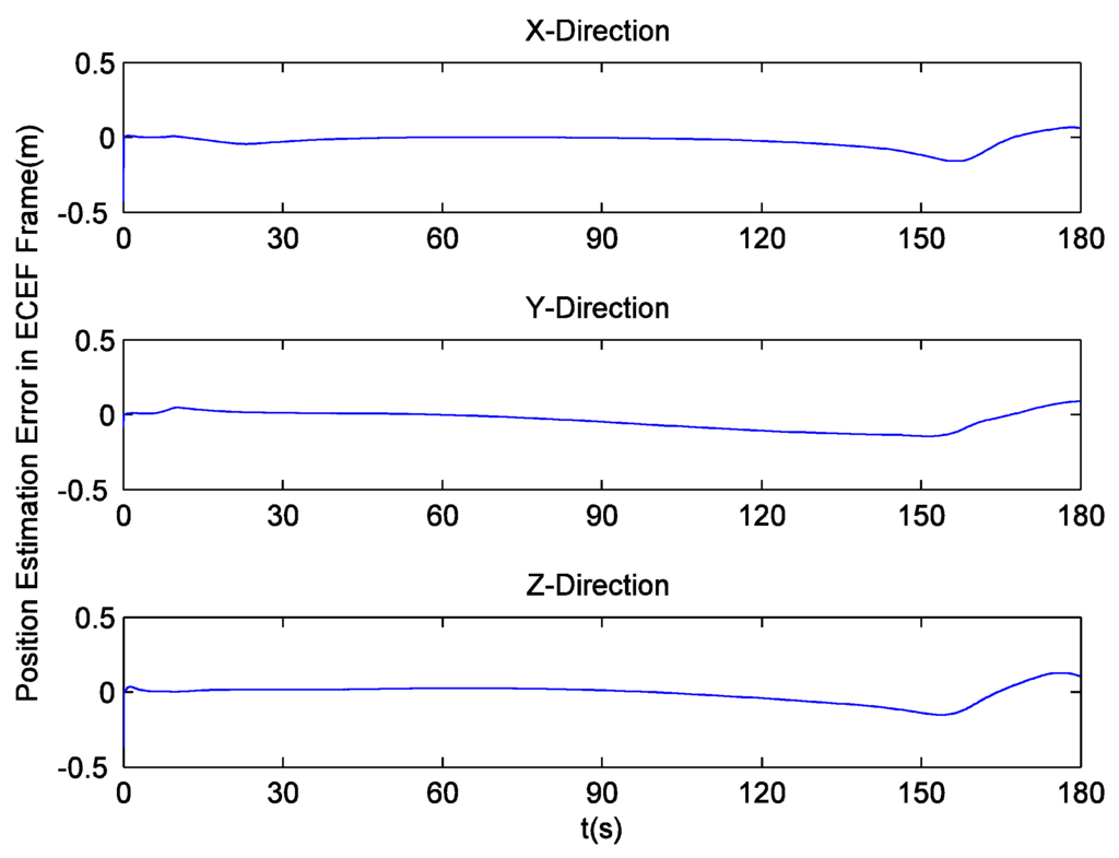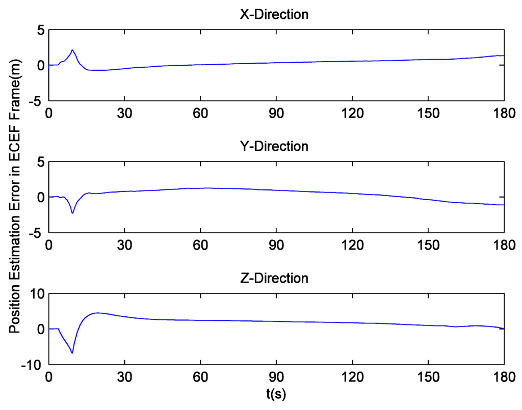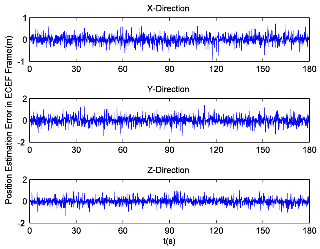On the other hand, Equation (28) can remain unchanged due to the fact that the code loop dynamic stress error is usually small. , which represents the current pseudorange output by the GPS tracking channel, can be calculated from and the previous pseudorange. Then, in Earth Centered Earth Fixed (ECEF) coordinate system, the observation equation of integrated navigation filter can be expressed as: