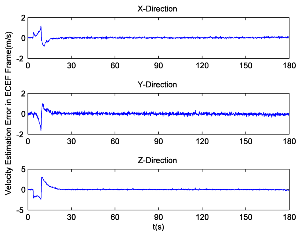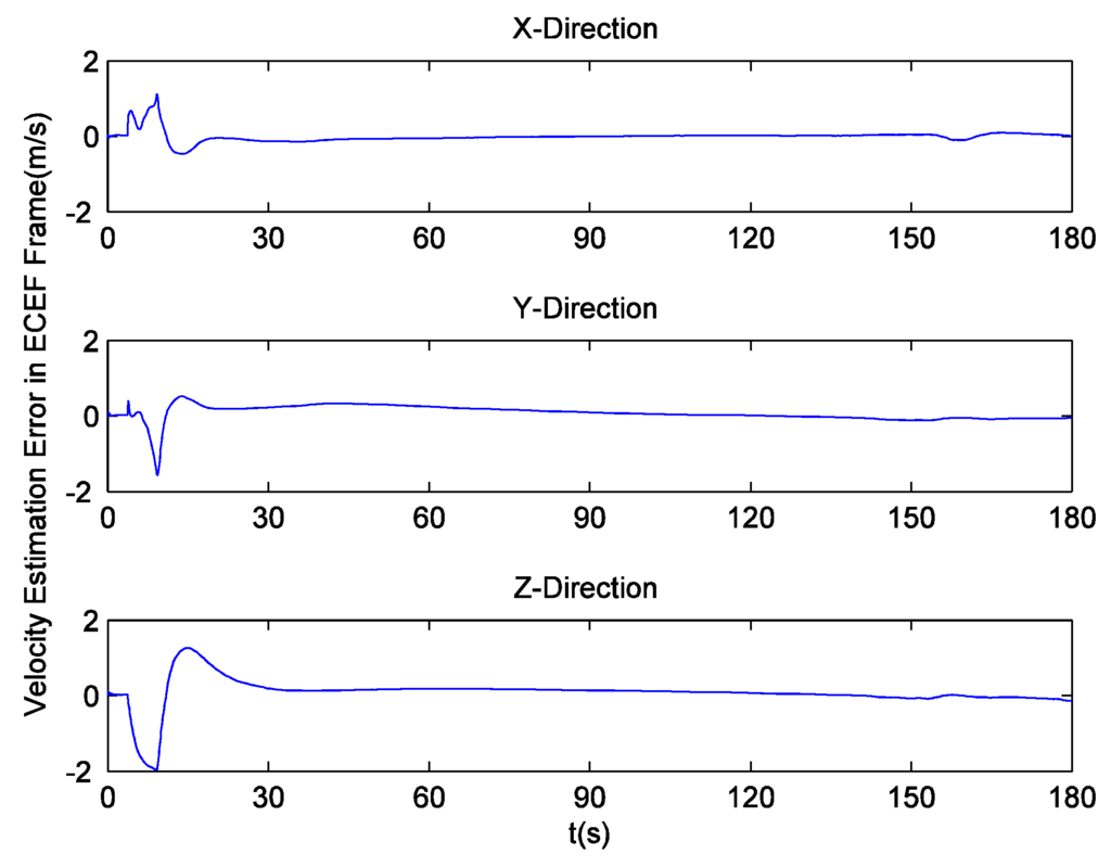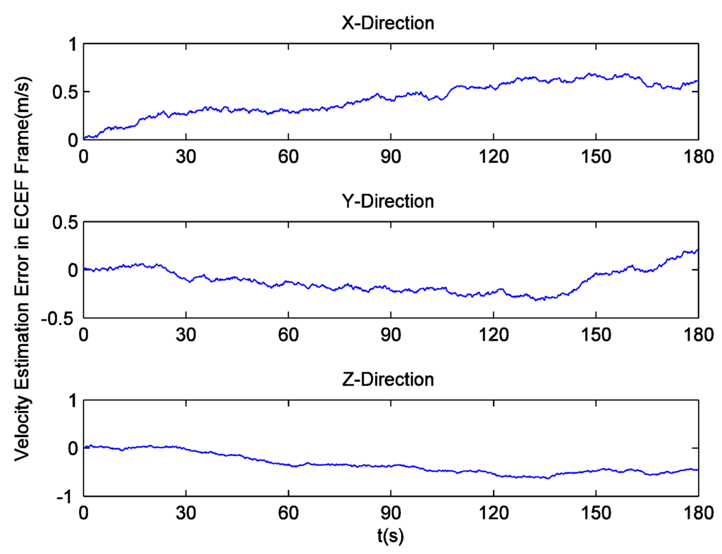 Since there is no loss of lock in dynamic simulation, the independent GPS receiver equipped with the new preprocessing model can implement navigation. However, in navigation domain, if KF is applied, the large error contained in the estimated Doppler shift may lead to inaccurate positioning results. Hence the independent GPS receiver still uses LS to obtain navigation results. Figure 14 and Figure 15 respectively show its position and velocity estimation errors in ECEF coordinate system. And Figure 16 and Figure 17 show the INS navigation errors in the same coordinate system. Meanwhile, navigation errors of the ultra-tight GPS/INS integration, namely the difference between the corrected inertial navigation information and reference values are shown in Figure 18 and Figure 19. Obviously, the velocity components estimated by the independent GPS receiver have large errors, which are on the order of 3 m/s, during the missile ascent phase. This is consistent with the carrier tracking result. For the case of INS, there is no sudden change in navigation errors. That is because INS is robust to vehicle dynamics. However, INS has the problem of error accumulation. At 180 s, the position errors are 76.3, −21.1 and −60.4 m, while the velocity errors are 0.6, 0.2 and −0.5 m/s. On the other hand, employing the navigation filter with expanded dimension, the ultra-tight GPS/INS integration can provide more accurate navigation results. The absolute maximum values of position errors and velocity errors are smaller than 0.5 m and 0.1 m/s, respectively.