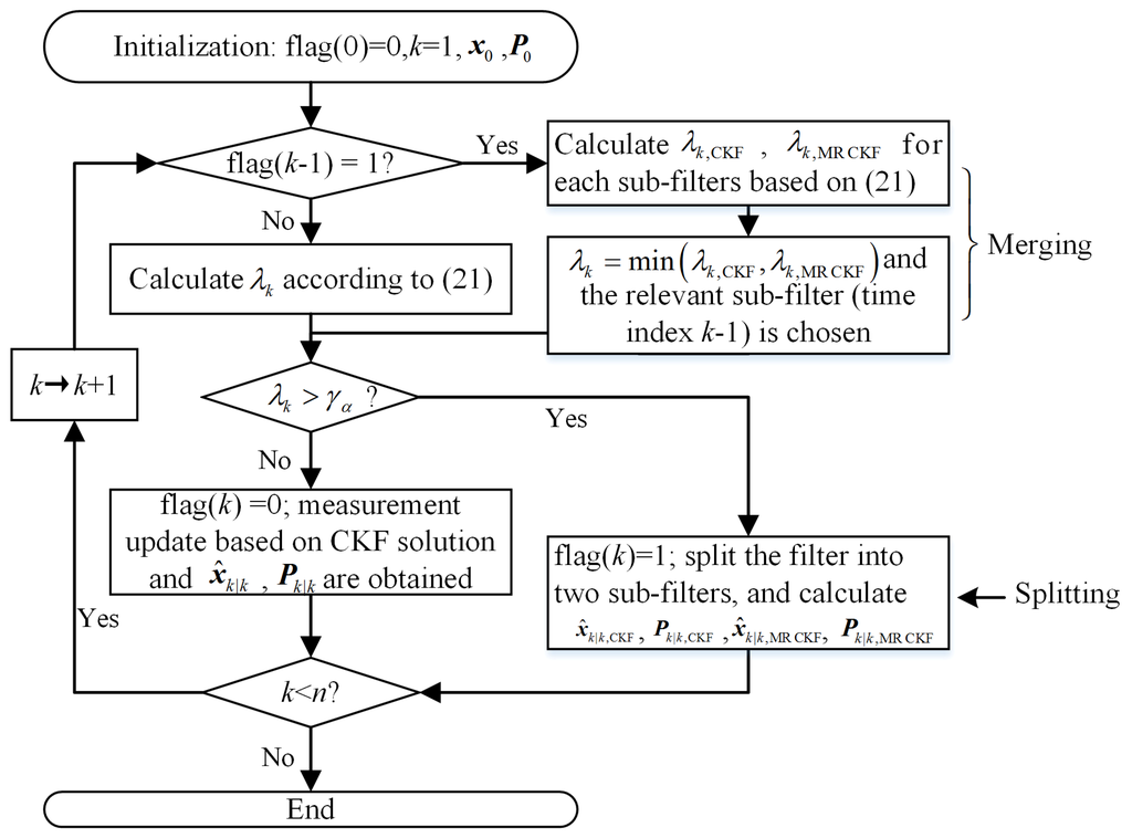 Here, we do not consider continuous outliers and propose a feedback strategy to solve the problem. When the outliers’ judgment variable exceeds the threshold at time index k, the filter is split into two sub-filters: the standard CKF and the MRCKF. Then they are updated according to their solution frameworks. At time index k + 1, the outliers’ judgment variables of the sub-filters can be obtained. If , the MRCKF is chosen, otherwise the CKF is chosen. The new filtering algorithm with the feedback strategy is named the feedback MRCKF (FMR-CKF). The flow diagram of the FMR-CKF can be summarized in Figure 1.