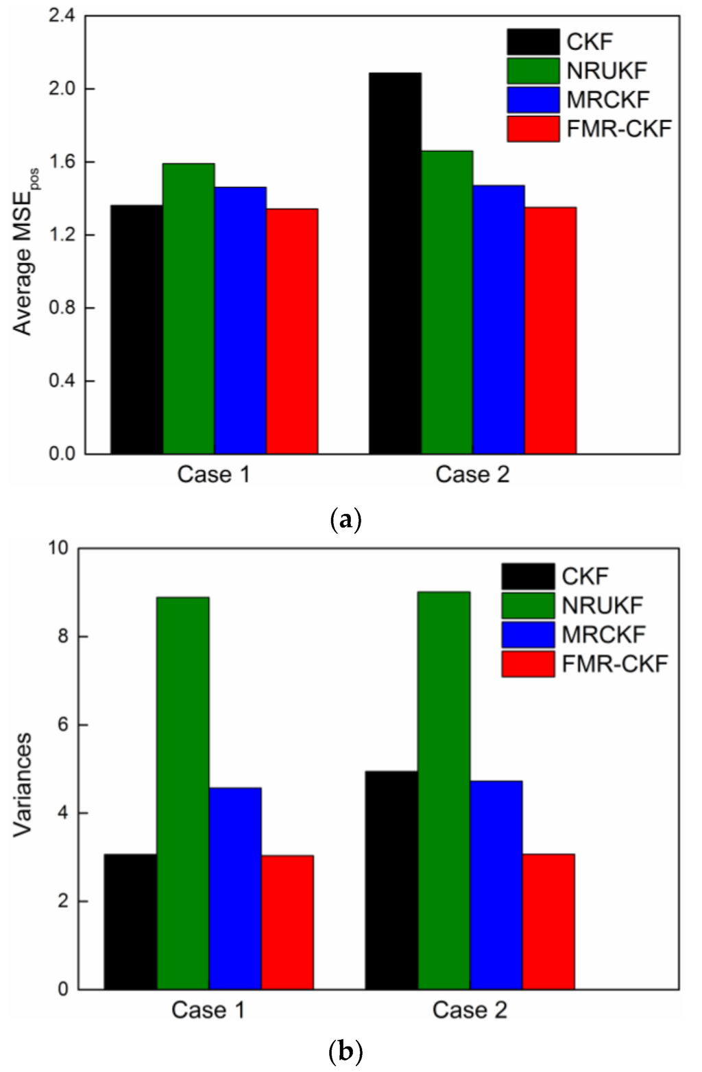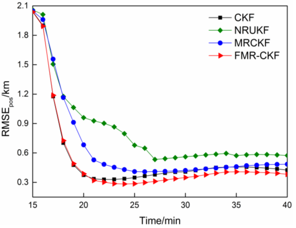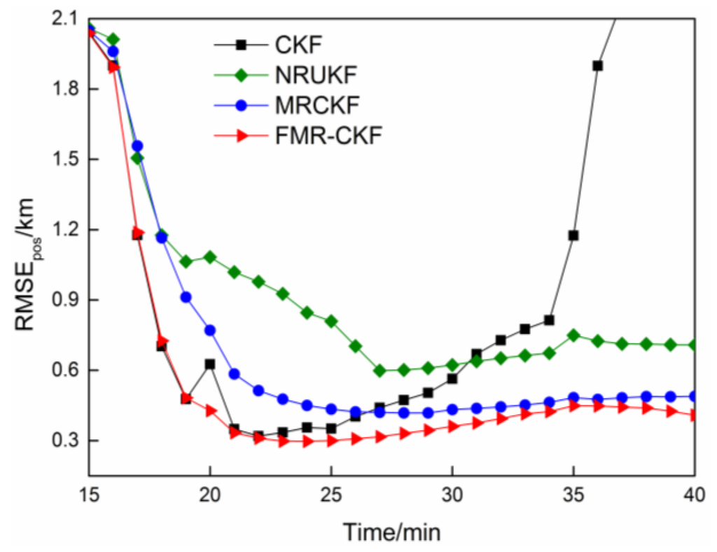 As can be seen in Figure 4, the average MSEspos and the corresponding variances of the FMR-CKF change smaller in different cases and are obviously lower than those of the other algorithms. It demonstrates that the FMR-CKF is more numerically stable and consistent than the other algorithms. The judgment variable of the NRUKF, i.e., the measurement residual, includes both predicted error and nonlinear error, which leads to unstable performance and, hence, the variances of the NRUKF are significantly higher than those of the other algorithms in different cases.