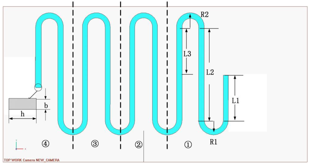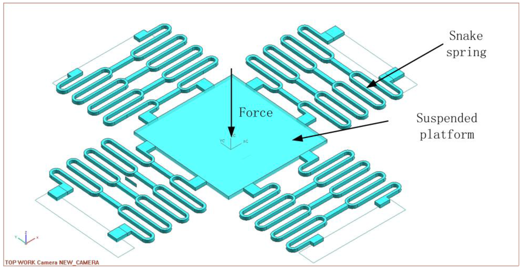 As illustrated in Figure 2, the microspring consists of the suspended platform and snake beams. The snake beams connect with the center platform at one end and are fixed by the supporters at the other end. The center platform will move downward or upward with the deformation of the beams. Since every snake beam consists of seven straight and curving beams, the length is prolonged while the stiffness constant increases. Then, the suspended platform could sustain large displacement. At the same time, the structure parameters such the beam length L, the radius of the curving beam R, the number of curving beams n, the height b, and the width h of the beam will be optimized to maximize the displacement under the external load. Supposing the external load (electromagnetic force) is focused on the center of the platform as a concentrated force, the elastic force will be analyzed by the energy method and simulated with ANSYS 14.0 software (ANSYS, Inc., Pittsburgh, PA, USA). Then the elastic coefficiency, the displacement versus the given load, the frequency response, the internal stress, and the key structural parameters optimization will be completed.