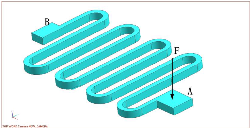 The energy method is based on the mechanism that the energy produced by the external force equivalent to the power produced by the internal stress. As illustrated in Figure 3, for a single beam, supposing the external load is exerted on the point A of the snake beam, the other end B of the beam is fixed on the supporter, where the DOF in all directions is 0. The length of the straight part of the beam is L, the radius of the curving beam is R, and the number of the beams is n. The sum power is obtained by calculating the deformation resulted from the external force on every part of the beam as written in Equation (1). Then the differentiation of the power to the force is calculated, which produced the deformation as expressed in Equation (2).