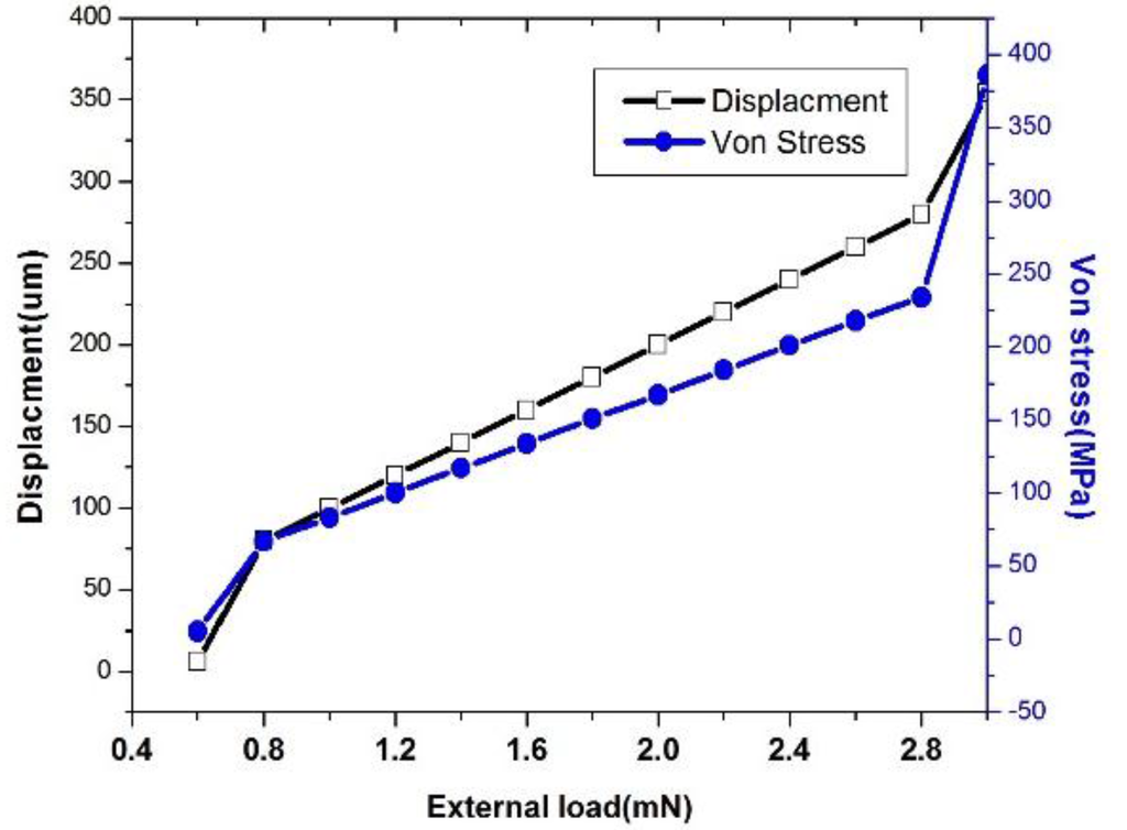 The dimension of the beam is shown in Table 3. Then, the external load for the initial value is 1 mN. The external force on the suspended platform increased from 1 mN to 3 mN. Then, the corresponding displacement is simulated and shown in Figure 5. When the external load is 1 mN, the maximum displacement is 100 μm. The elastic co-efficiency is 10 N/m. When the displacement is more than 160 um, the corresponding external load is 1.6 mN. Next, the external load of 3 mN is exerted on the beam, and the maximum displacement is 354 μm. In order to avoid the mechanical failure of the device, the internal stress distribution is simulated. The maximum stress usually occurs at the connecting area of the beams and center platform. When the external load reaches 3 mN, the maximum internal stress is less than yielding stress, which indicated the reliability of the microspring.