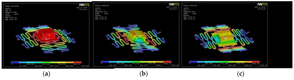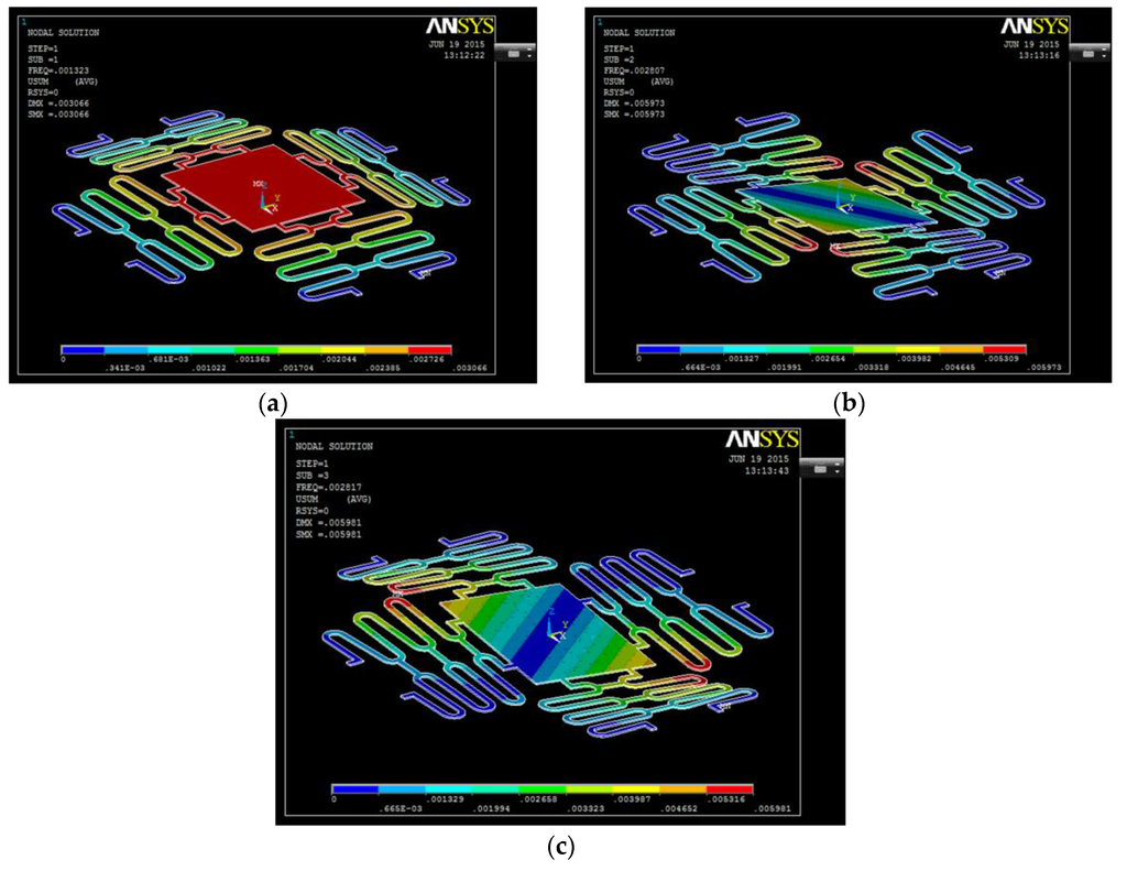 The model of the spring is of interest. The dynamic behavior of the moving stage is analyzed: three natural frequencies and the corresponding mode shapes. As shown in Figure 6a, the first model has a frequency of 133 Hz, and the mode shape of pure translational motion normal to moving platform. This constraint prevents the structure from being too compliant in the latter direction, which is ideal for the top electrode to contact closely with the bottom electrode. The second and third mode shapes in Figure 6b,c are rocking modes at 282 Hz along the X and Y axis. In order to avoid laterally moving of the platform, the second and third modes must be kept away. These two modes are at least 120% larger than the first mode, so the presented design provides enough separation between the desired motion and potential parasitic motions.