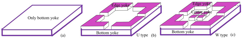 Three types of magnetic yoke designs. (a) Only bottom yoke; (b) U type yoke; (c) W type yoke.