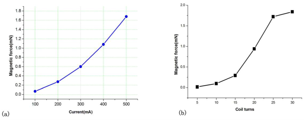 The magnetic force with different driving current and coil number turns. (a) magnetic force with current; (b) Magnetic force with coil turns.