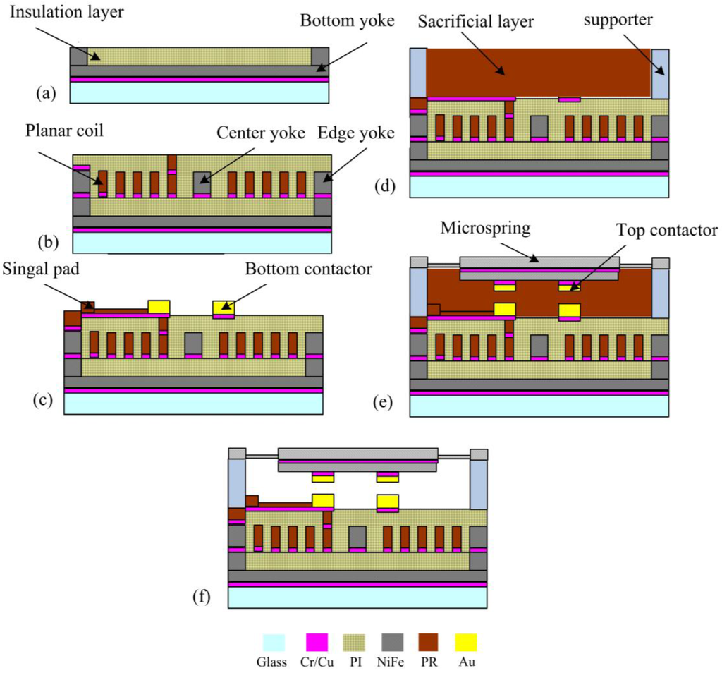 Microfabrication process of the microswitch on a single glass wafer. (a) bottom yoke electroplating; (b) coil electroplating; (c) bottom contactor electroplating; (d) supporter electroplating; (e) microspring electroplating; (f) releasing of device.