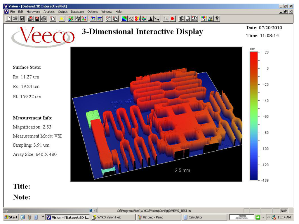 In order to observe the contour of the device, the Veeco 3-Dimensional Interactive optical profiler (Wyko NT9100VEECO, Veeco Instruments, Inc., New York, NY, USA) is utilized. As display in Figure 12, the Rt represent the distance between the surface of the moving platform and the substrate, which indicates the air gap/displacement, means 159.22 μm. It is means that the difference between the design and fabrication value is 0.5%, which indicates precise fabrication process.