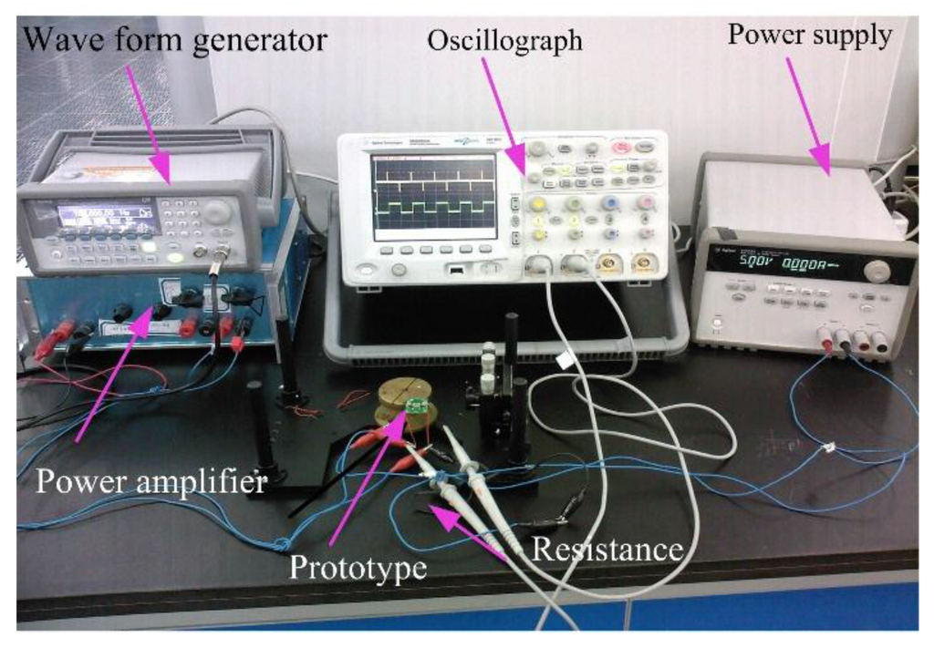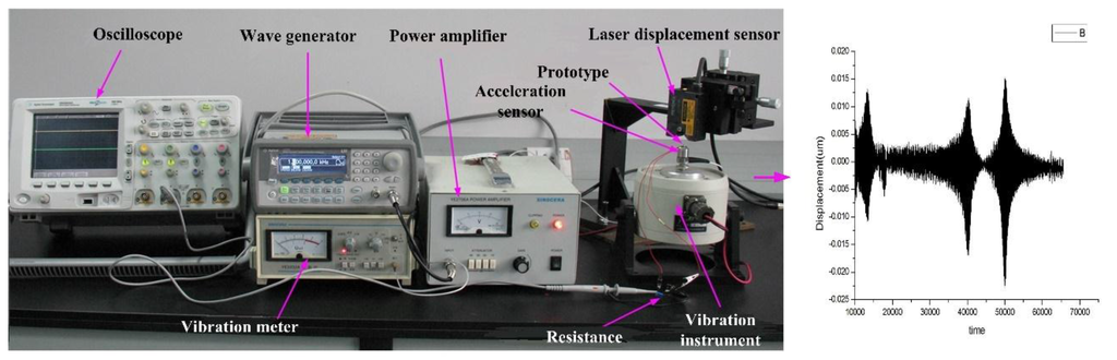 The frequency testing system is shown in Figure 13. By changing the voltage of the vibration meter, the corresponding signal is generated by a GW waveform generator (GFG-8016G, GW, Inc., Taiwan, China) incorporated with B and K 2706 power amplifier (GW, Inc., Taiwan, China). The vibration platform is activated with the prototype at the different acceleration, while the oscilloscope (Agilent MSO6034, NI, Inc., Santa Clara, CA, USA) observes the input and output amplitude. The laser displacement sensor detected the vibration amplitude at the same time and transformed it to the computer for analyzing as shown in left part of Figure 13. After a Fourier transform, the frequency information is extracted. The elastic coefficiency is obtained. The tested frequency is 125 Hz, which shows agreement with the simulation results.